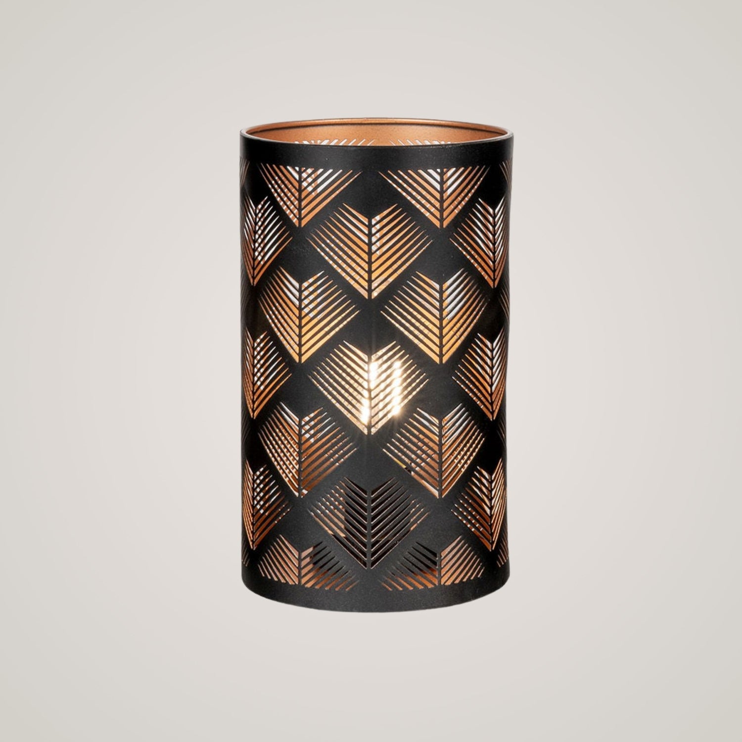 Skap en varm og innbydende atmosfære med Nata LED lyslykt Geo. Denne stilfulle lykten har et moderne, laserskåret mønster i svart metall med en elegant kobberfarget innside som reflekterer lyset vakkert.