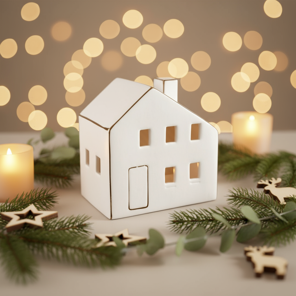 Hvitt keramikkhus med skråtak, sett fra skrå vinkel mot nøytral bakgrunn.