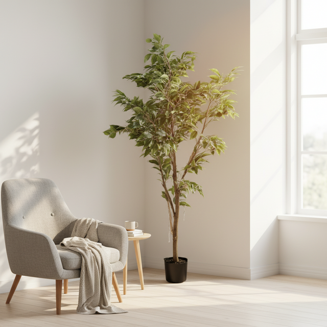 Kunstig tre i potte. Dette nydelig treet har et naturtro og stilrent design. Fikus Benjamin treet er fra høykvalitetsmerket Mr. Plant og er perfekt til å friske opp hjemmet. Potten passer til de fleste blomsterpotter.