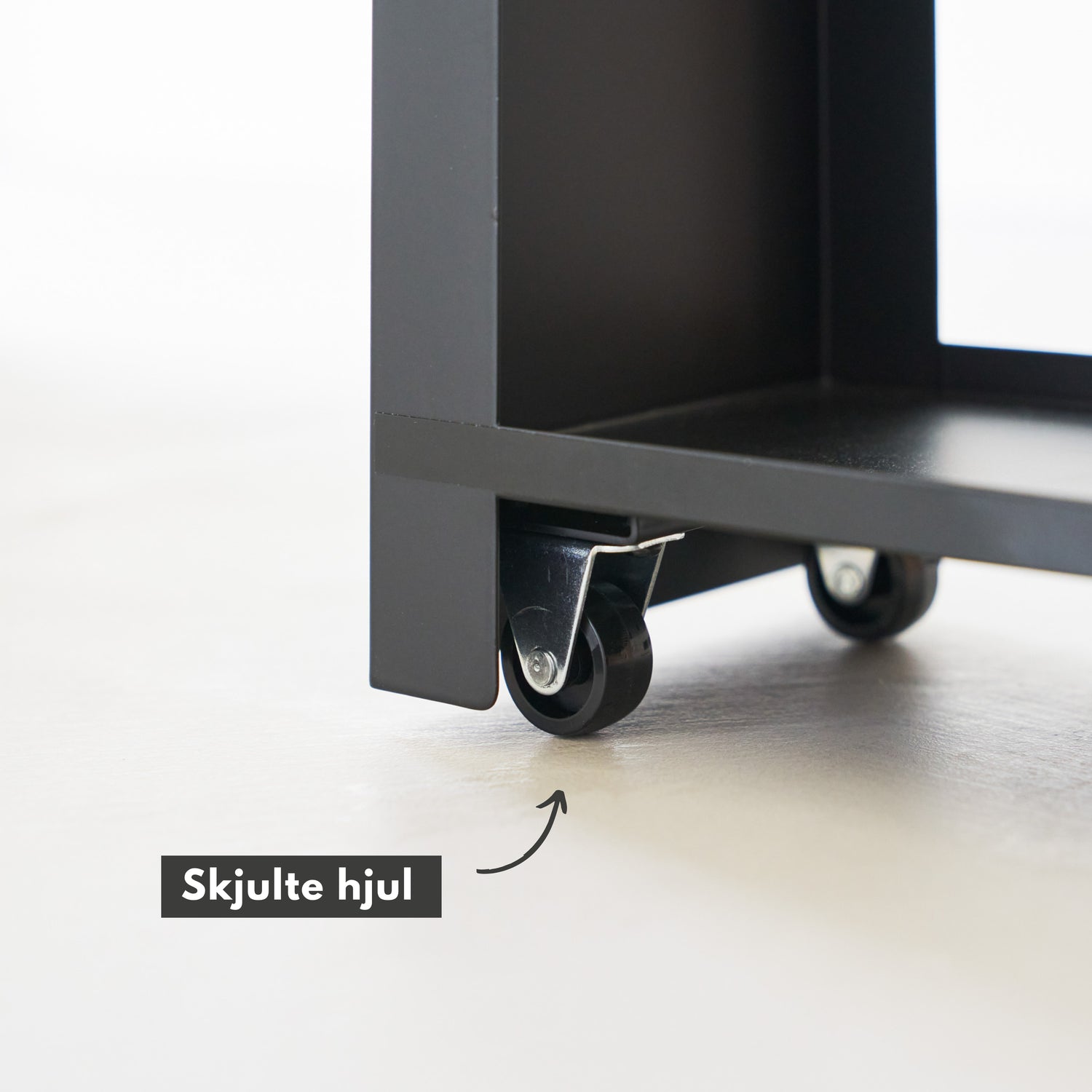 Denne funksjonelle oppbevaringshyllen kombinerer praktisk lagring med et moderne uttrykk. Den smarte skuffen kombinert med inndelinger gir enkel tilgang til innholdet, samtidig som alt holdes ryddig og ute av syne.