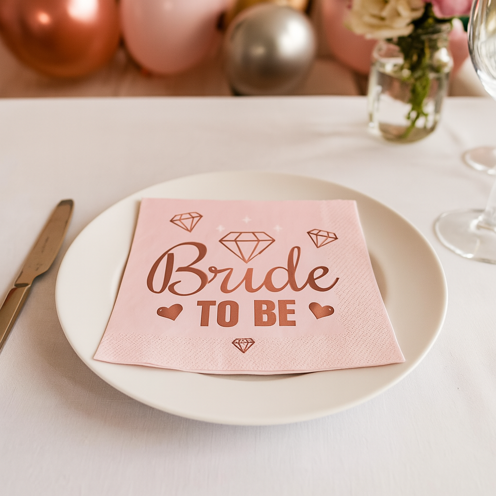 Snygga, rosa servetter med texten "Bride to be". Servetterna är gjorda av 3-lagers papper och kommer i en förpackning med 20 servetter. Perfekta servetter för möhippan.