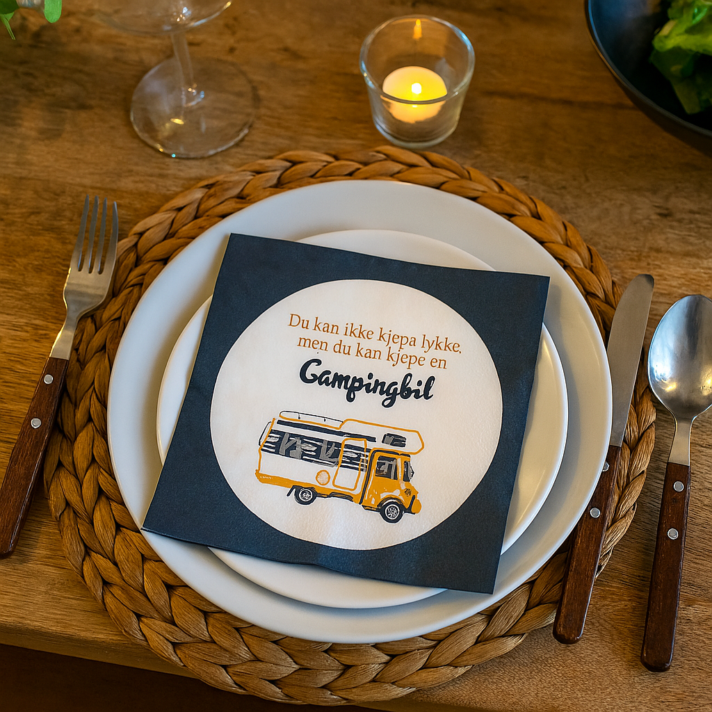 Nydelige trelags servietter i mørkeblått og hvitt med bilde av en campingbil. Passende for capming.