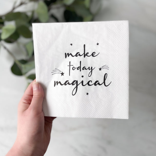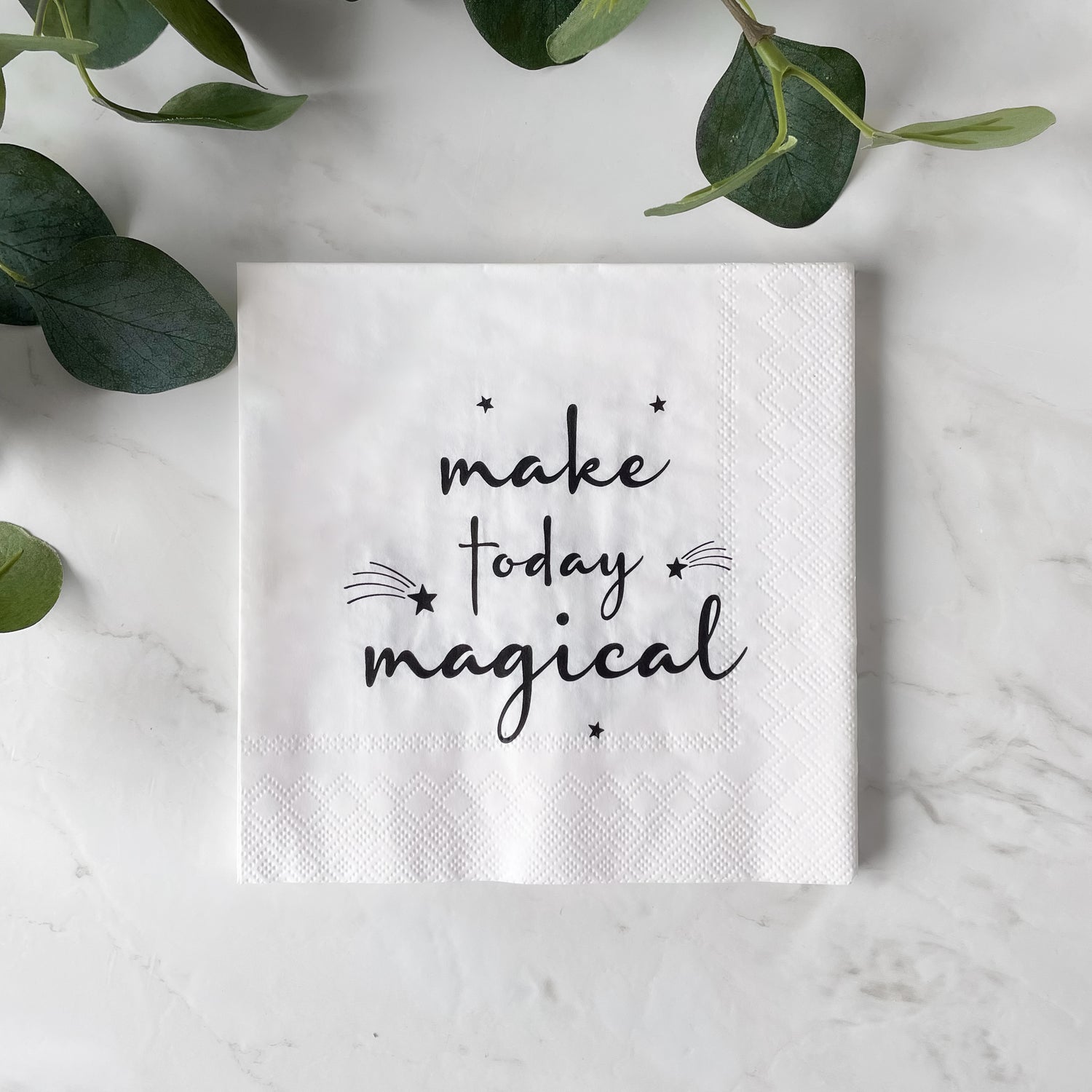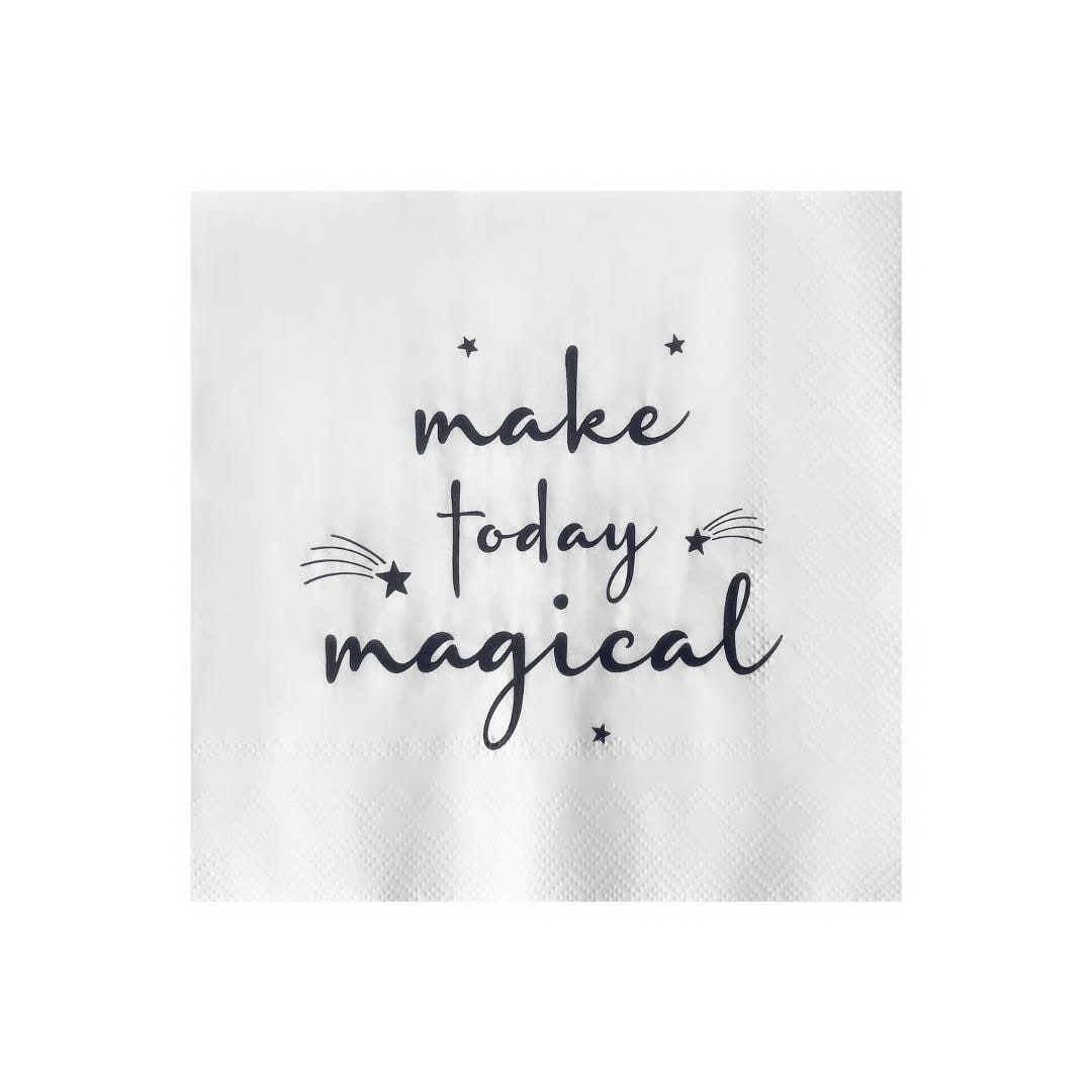Vackra vita servetter med det fina budskapet "gör idag magisk". Perfekt för dop, födelsedagar eller andra fester. Servetterna är 3-lagers pappersservetter och kommer med 20 st i förpackningen.