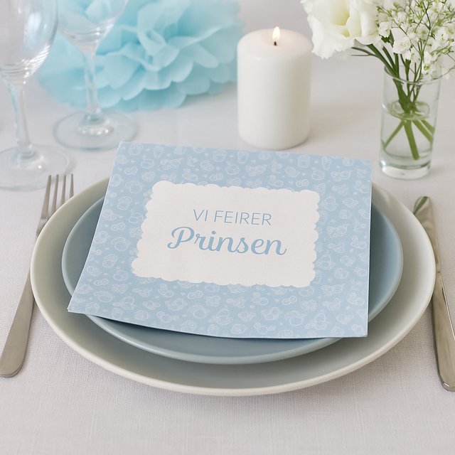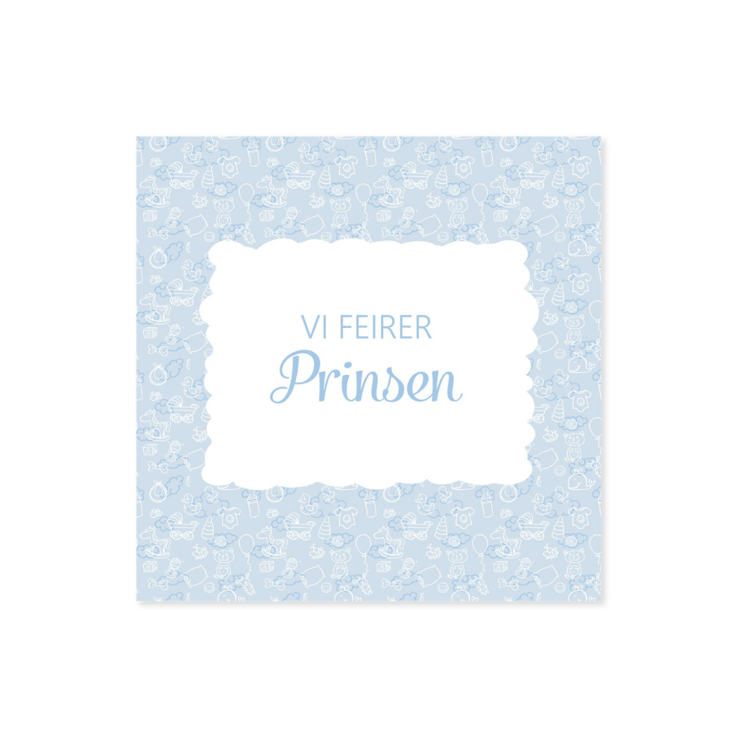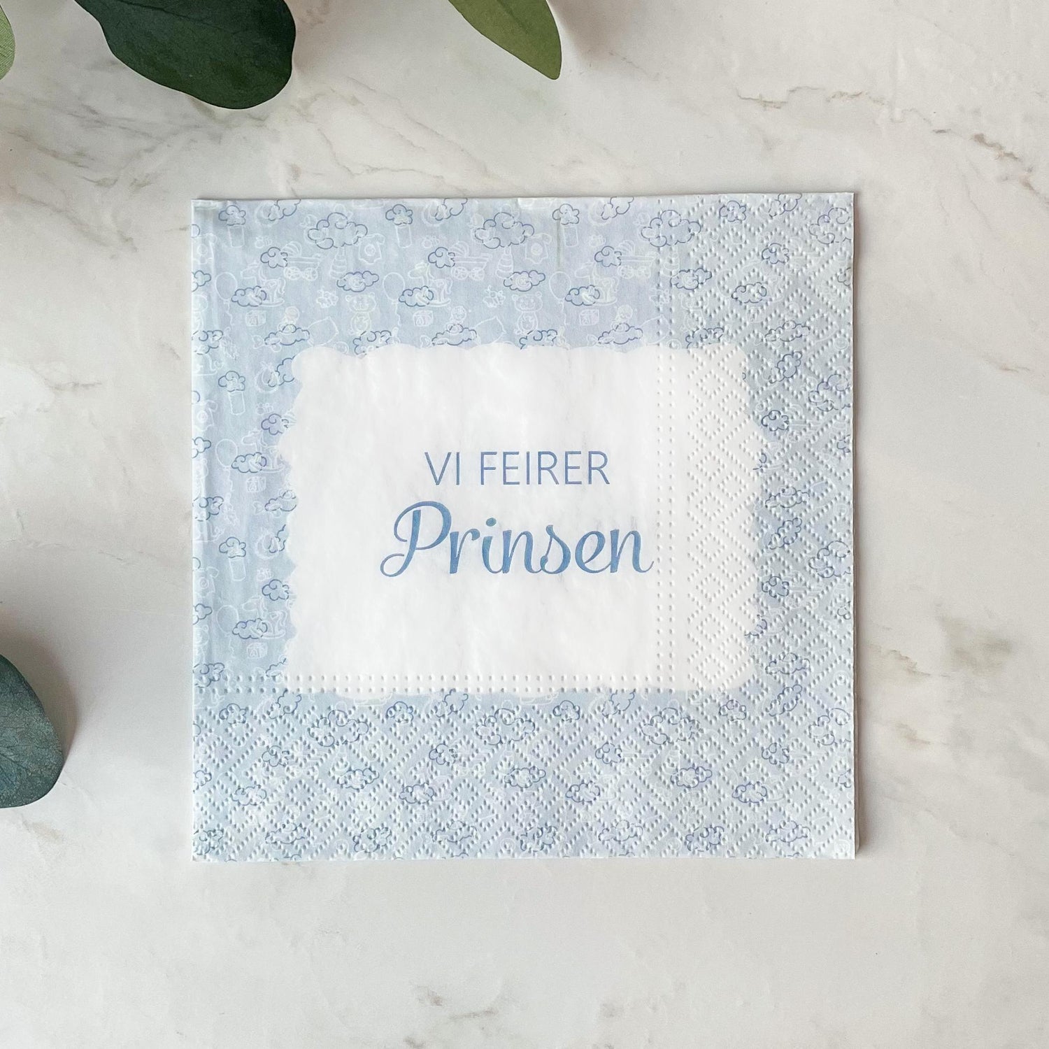 Servetter för dop och barnfödelsedagar. Dessa vackra blå servetter har texten "We celebrate the prince" Servetterna är 3-lagers pappersservetter och kommer med 20 st i en förpackning.