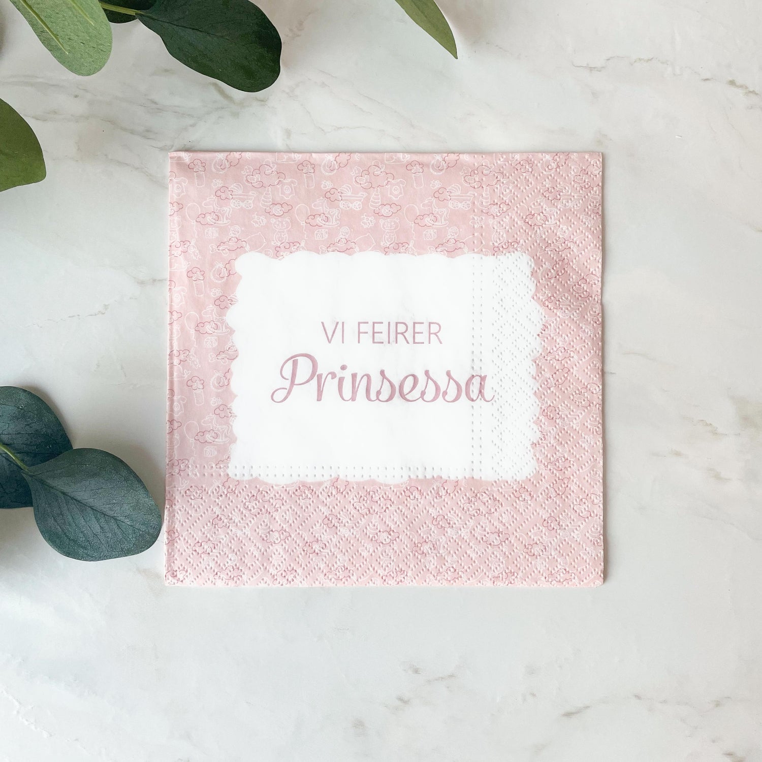 Servetter för dop och barnfödelsedagar. Dessa vackra rosa servetter har texten "We celebrate the princess" Servetterna är 3-lagers pappersservetter och kommer med 20 st i en förpackning.
