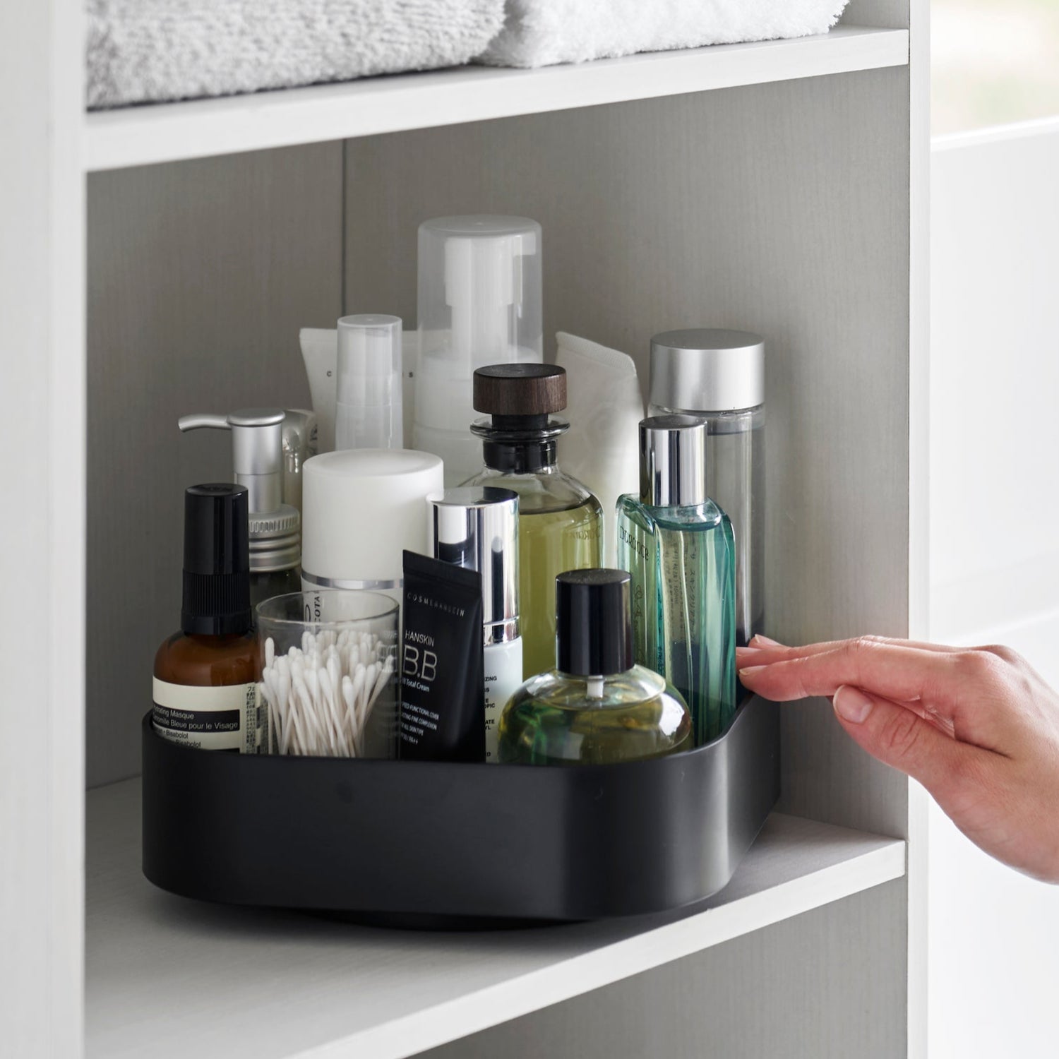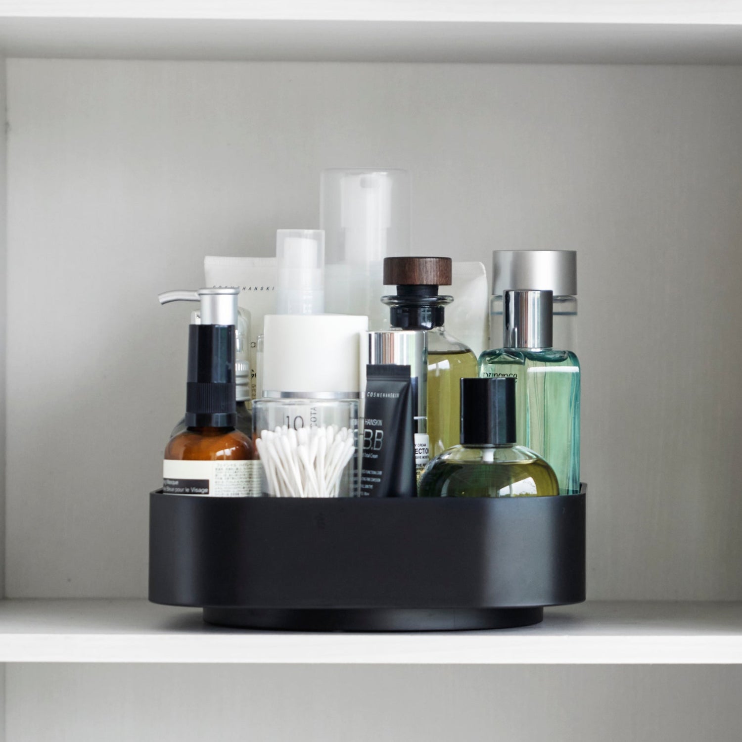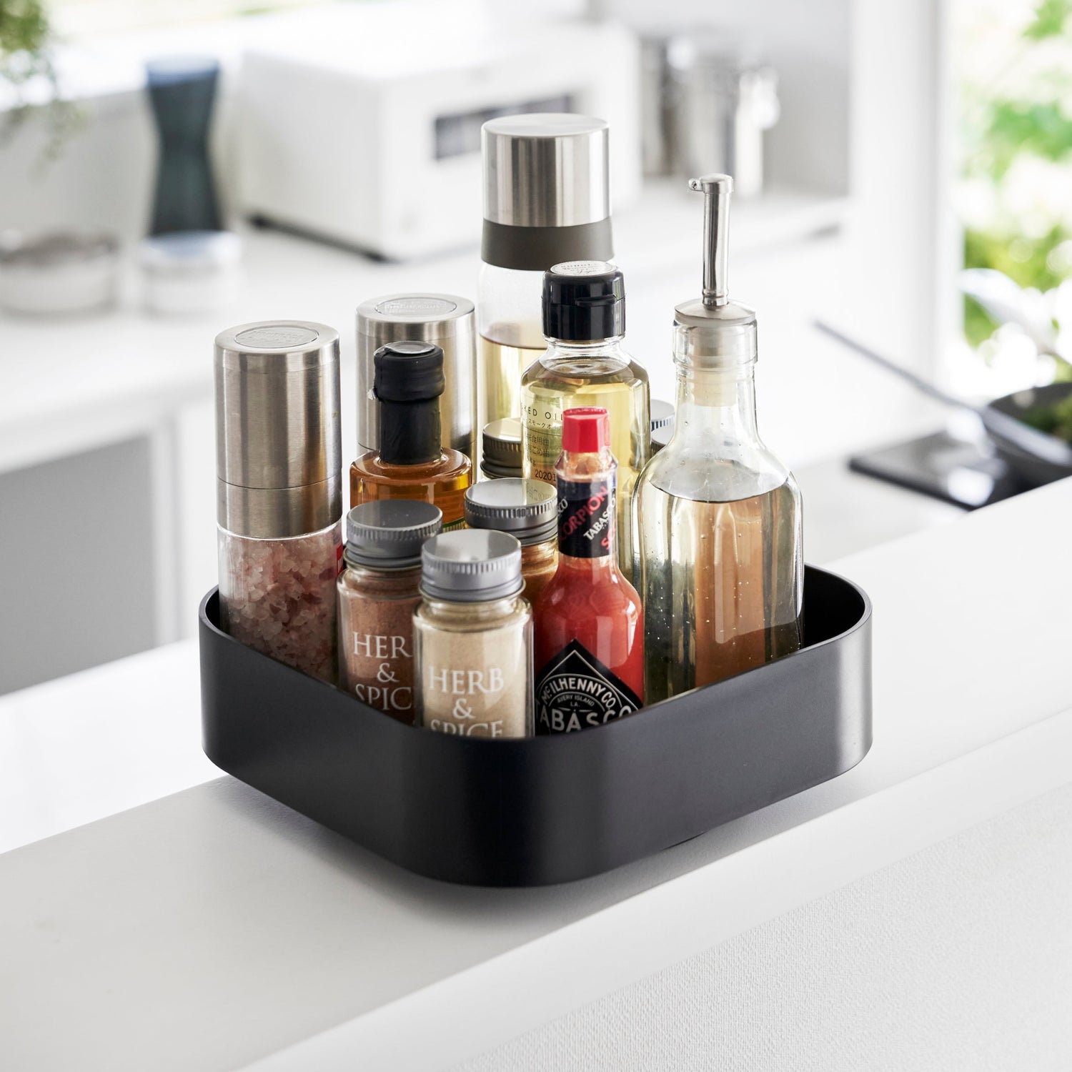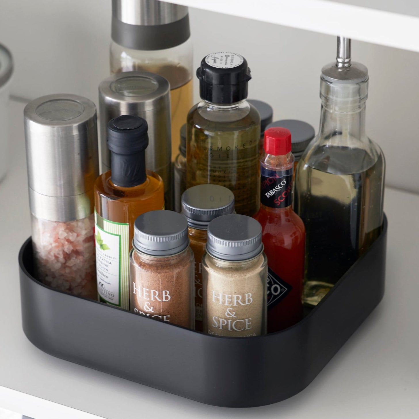 Roterende oppbevaringsbrett i sort for organisering av kjøkkenartikler.