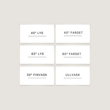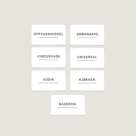 For et ryddig og stilig vaskerom, tilbyr vi etiketter for ulike typer vaskemidler og rengjøringsprodukter. Hell vaskemiddel over i pene beholdere. Merk dem tydelig med etiketter, slik at alt har sin faste plass. Perfekt for å holde oversikt over hva som er tilgjengelig og gir et harmonisk uttrykk.