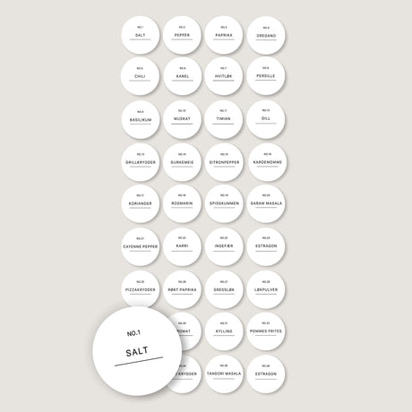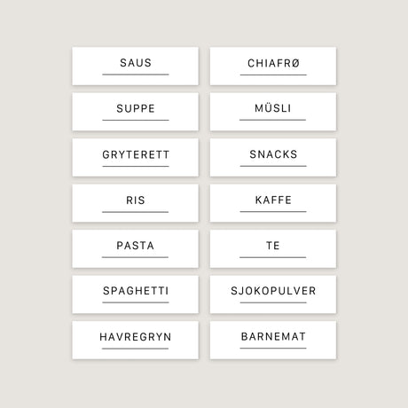 Er du lei av rotete krydderhyller og uorganiserte kjøkkenbenker? Lindas Dekor tilbyr etiketter til krydder, bakeingredienser og tørrvarer. Fest etikettene på glass eller beholdere for å skape en oversiktlig og praktisk kjøkkeninnredning. Du kan velge mellom elegante, minimalistiske design som passer inn i alle typer kjøkken.