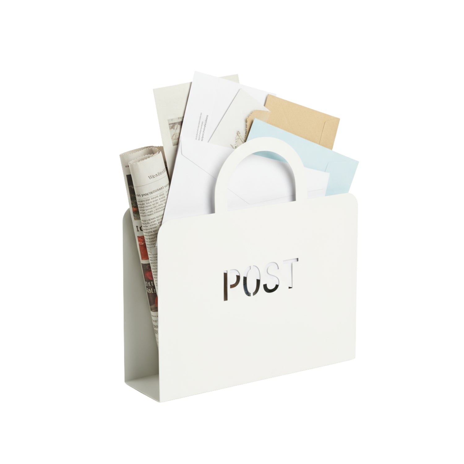 Minimalistisk og moderne oppbevaringskurv til brevpost i hvitlakkert metall.
