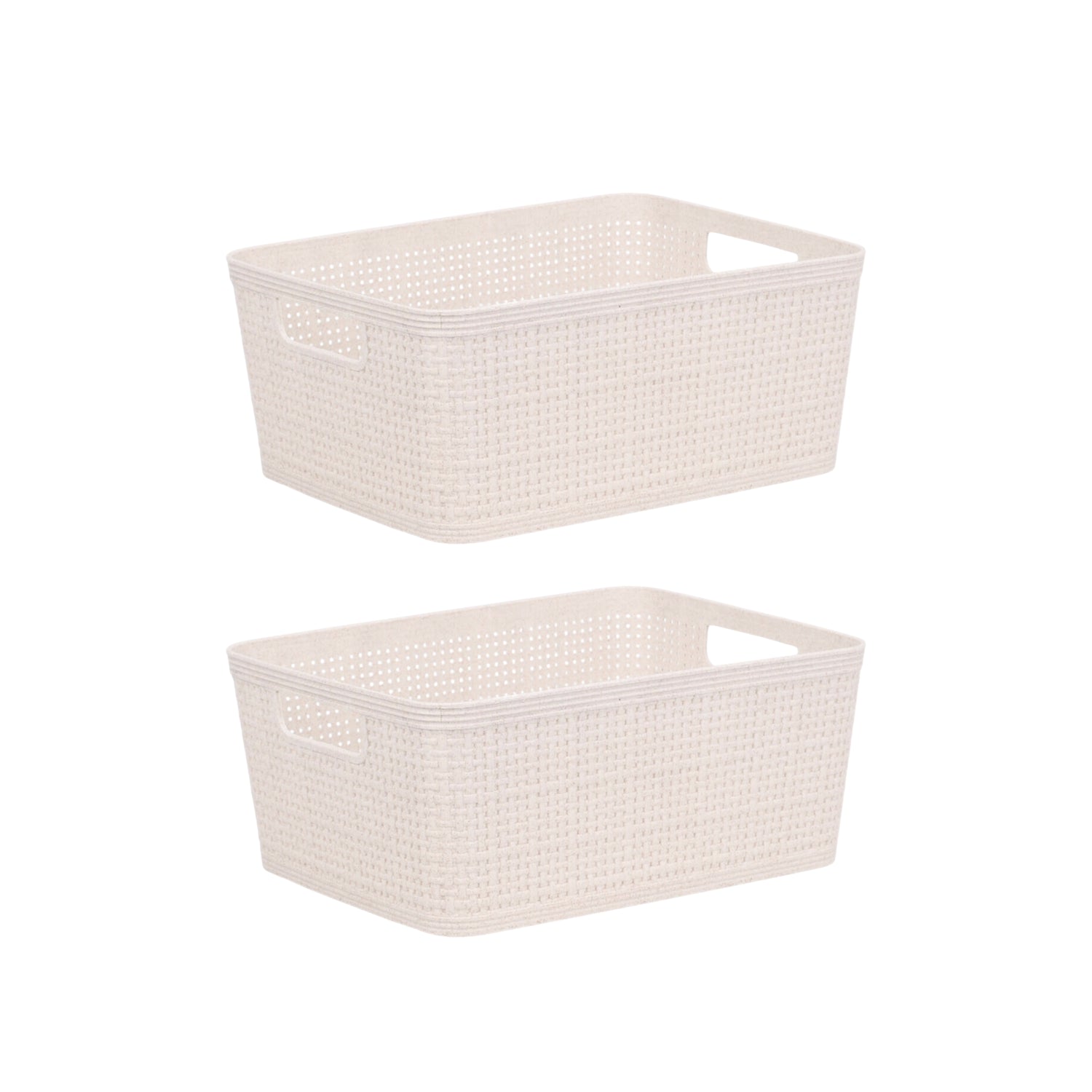 Praktiske og dekorative oppbevaringskurver i sandfarget plast med vevd design. Kurvene er lette, slitesterke og enkle å rengjøre, samtidig som de gir et moderne og ryddig uttrykk. Perfekte til småoppbevaring på badet, kjøkkenet, kontoret eller i garderoben.