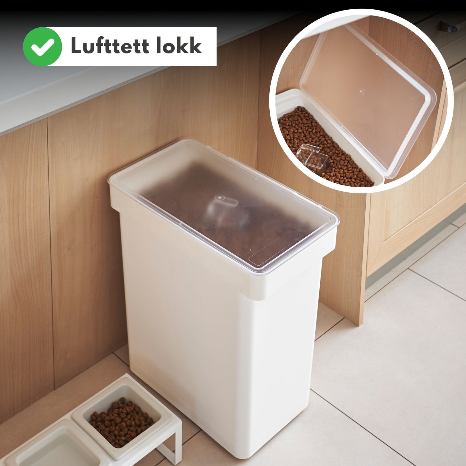 Det lufttette lokket sørger for optimal oppbevaring og forhindrer luktspredning. Med en kapasitet på opptil 12 kg er denne boksen ideell for tørrfôr til hunder, katter eller andre kjæledyr.