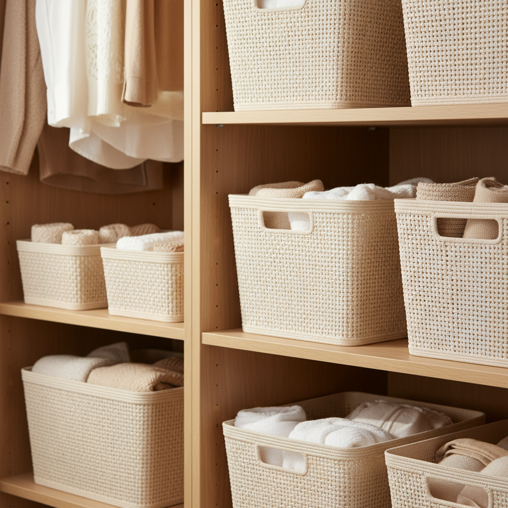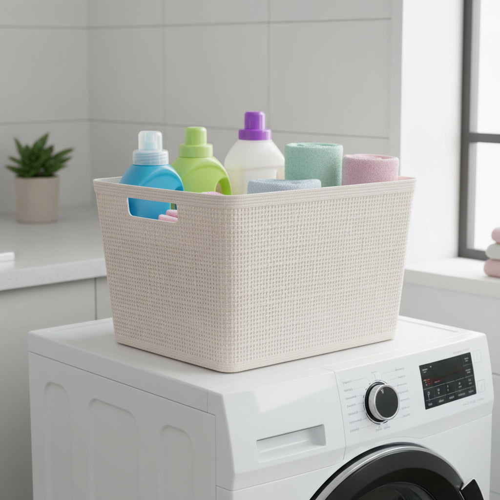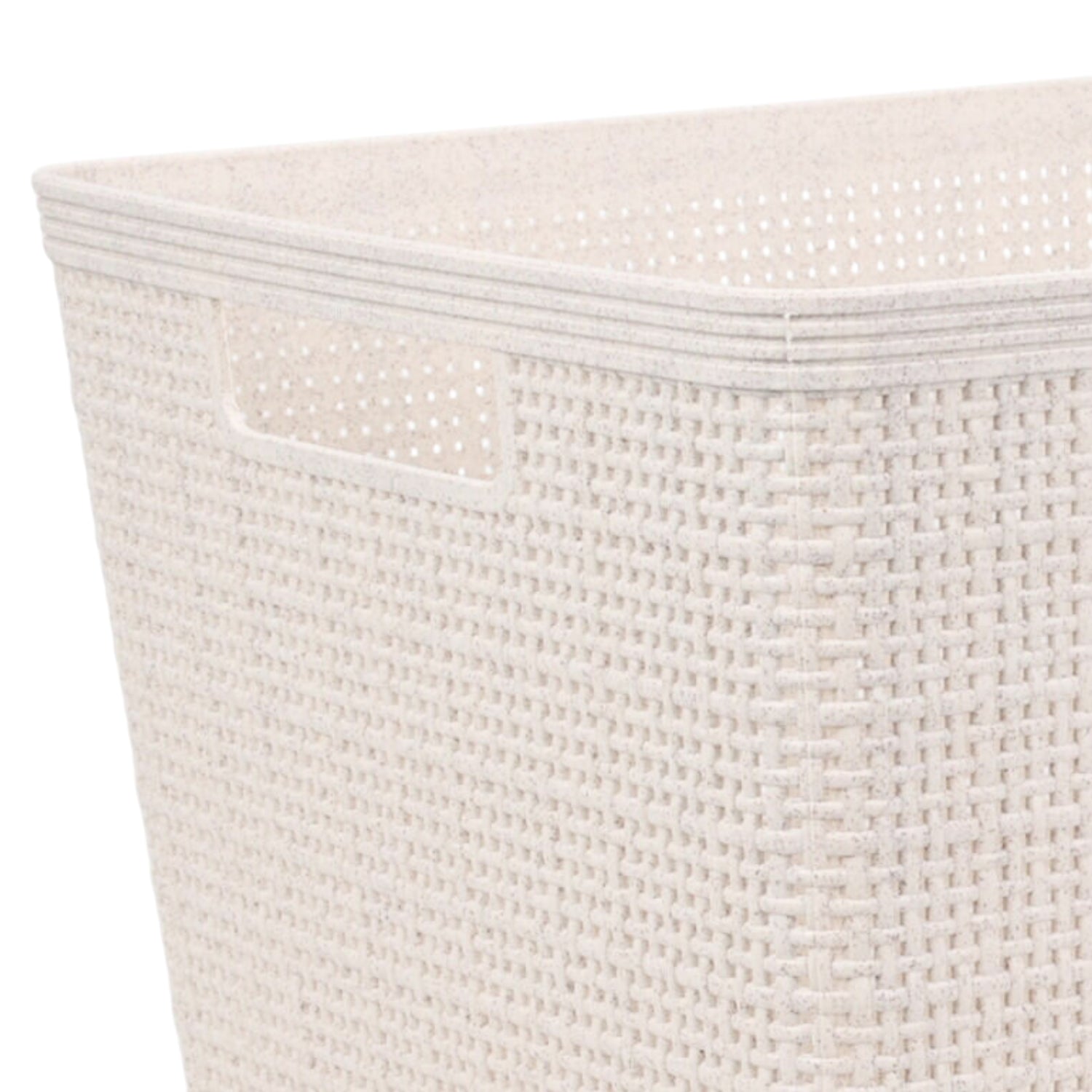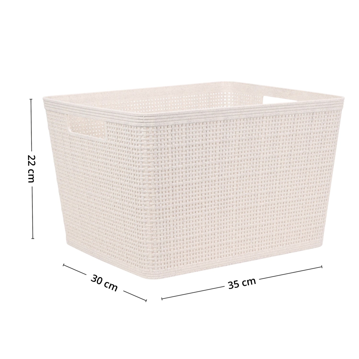 Praktiske og dekorativ oppbevaringskurv i sandfarget plast med vevd design. Kurven er lett, slitesterk og enkle å rengjøre, samtidig som de gir et moderne og ryddig uttrykk. Perfekte til småoppbevaring på badet, kjøkkenet, kontoret eller i garderoben.