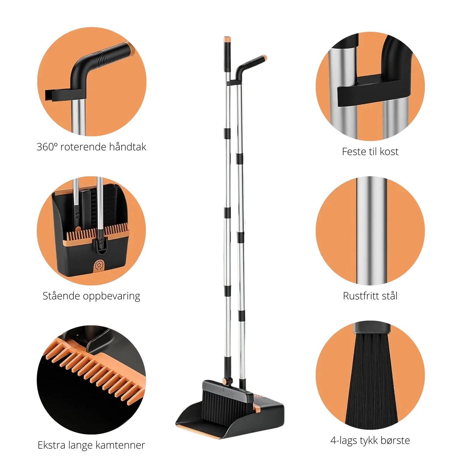 Dette praktiske kost- og støvbrettsettet med støvfanger gjør rengjøringen enkel og effektiv! Kosten har slitesterke børster som raskt feier opp smuss og støv, mens støvbrettet er utstyrt med en smart støvfanger som holder på at du kan enkelt fjerne hybelkaniner og hår fra børsten.