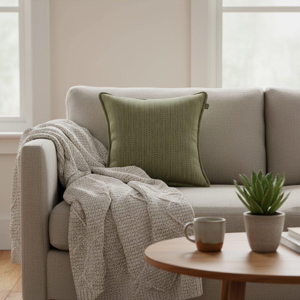 Ge ditt rum en exklusiv touch med kuddfodralet Halvor Bakke Asima . Den gröna färgen och den fina strukturen skapar värme och djup i inredningen. Överdraget är tillverkat av återvunnen ull i kombination med slitstarka fibrer, vilket ger ett naturligt utseende och en bekväm känsla.