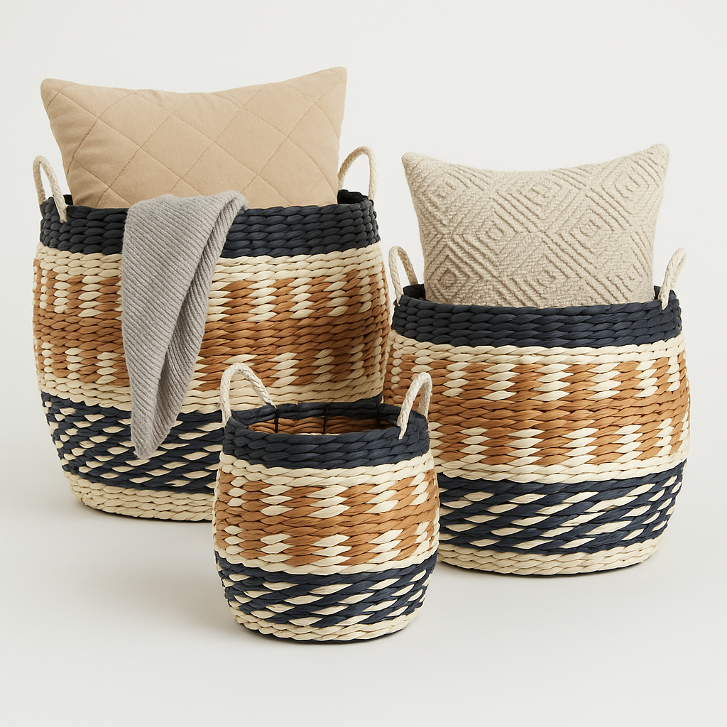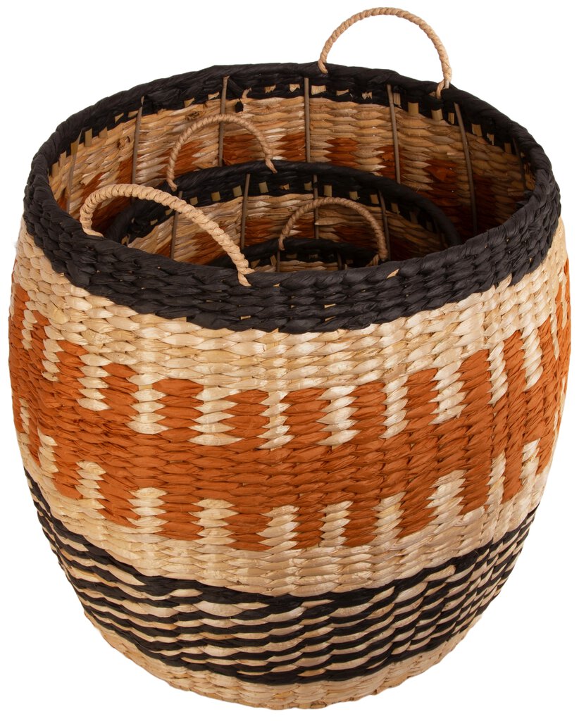 Dette flettede kurvsettet består av tre vakre kurver i naturlig materiale med et dekorativt brunlig mønster.