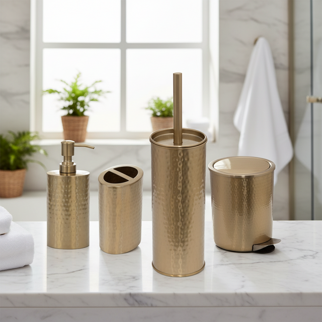 Gi badet et helhetlig og gjennomført uttrykk med dette komplette baderomssettet i metall. Settet har en flott hamret overflate som gir liv og karakter uten å ta for mye oppmerksomhet. Den varme gulltonen tilfører et eksklusivt preg som passer både på moderne og klassiske bad.