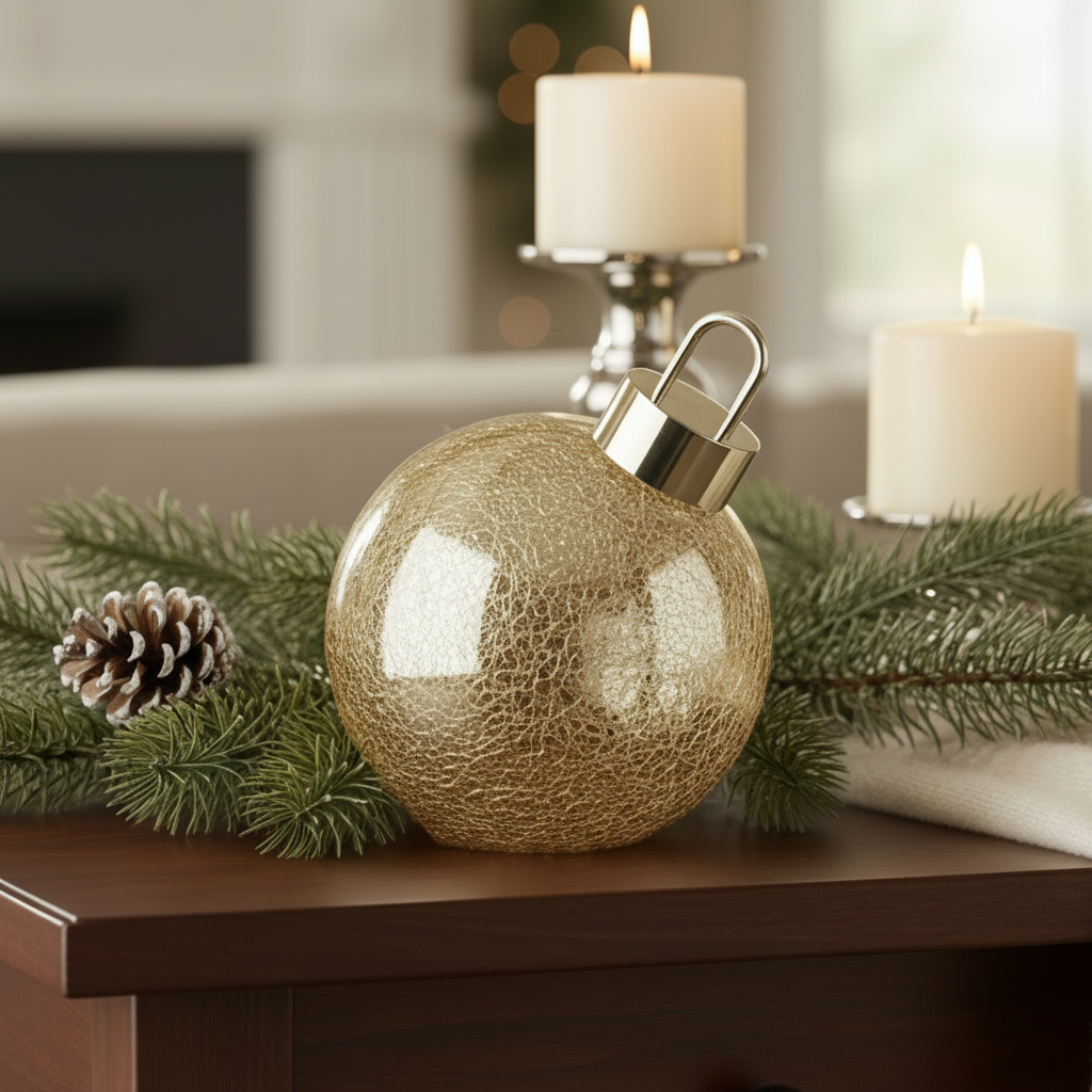 Skap en elegant julestemning med denne lekre julekula i gullfarget glass med LED-lys. Den lille dekorasjonskulen gir et varmt og stemningsfullt lys, perfekt til å pynte bord, vinduskarm eller som del av en større juledekorasjon. Det eksklusive gullglasset gir et luksuriøst preg som passer både til moderne og klassisk juleinteriør.