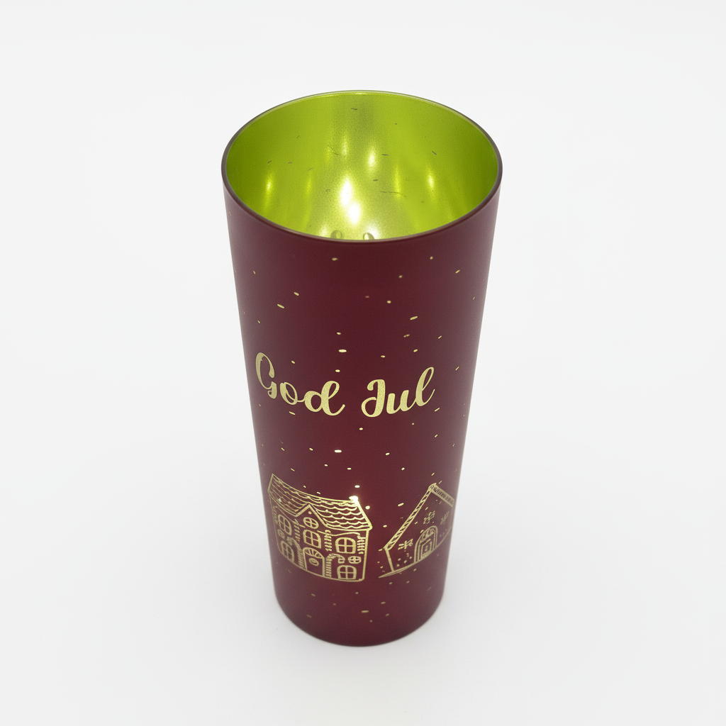 Rød lyslykt med motiv av pepperkakeby og teksten God Jul