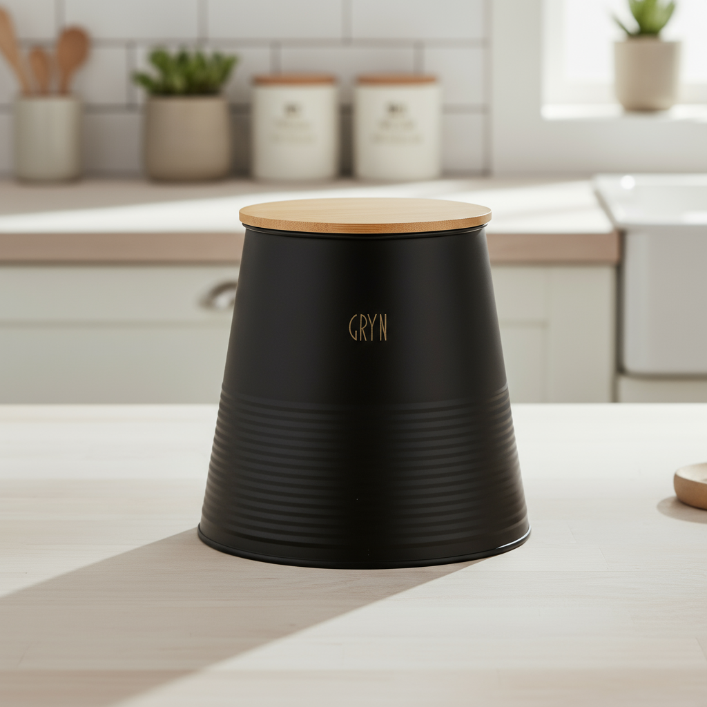 Den guldfärgade GRYN-inskriptionen gör det enkelt att skilja lådan från andra livsmedel och ger samtidigt en dekorativ touch till köksbänken eller i skåpet. Perfekt för havregryn, quinoa, couscous, ris och andra torra livsmedel du vill hålla koll på.