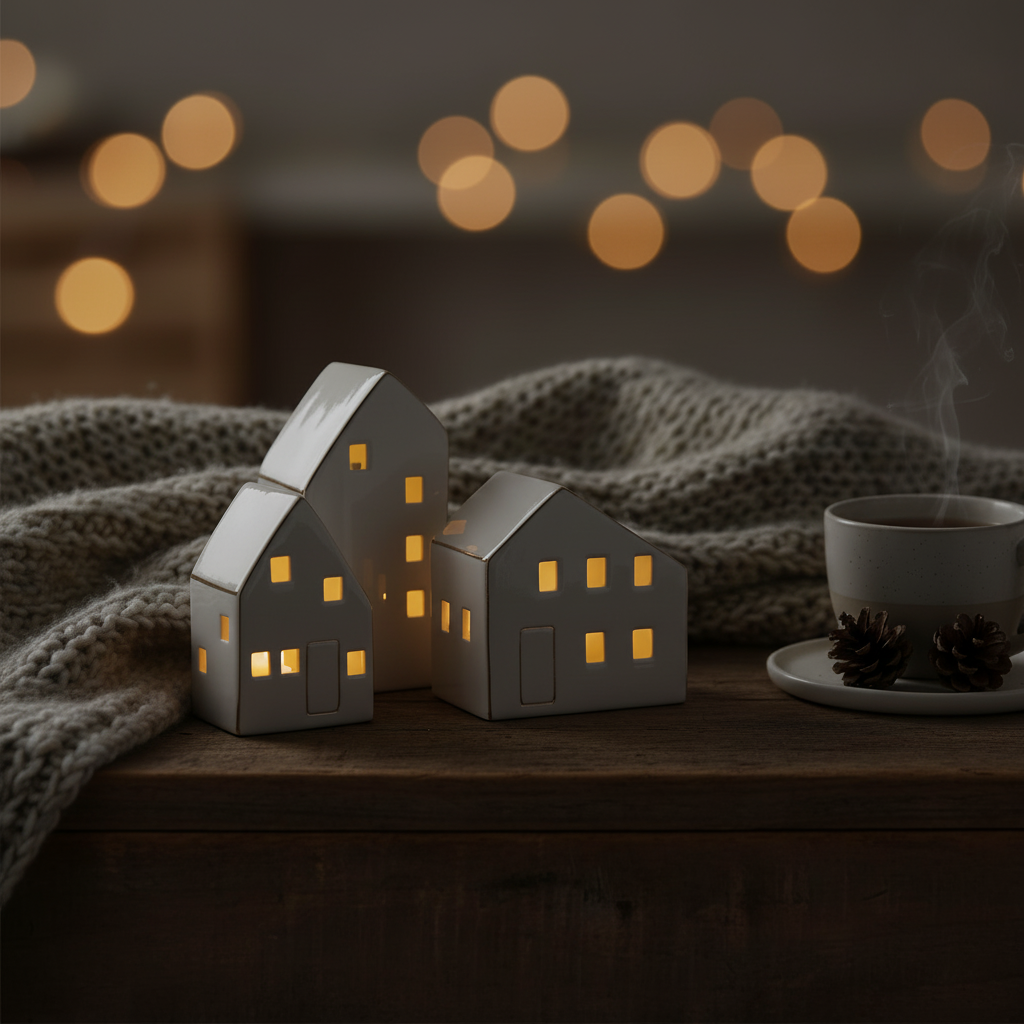 Tre keramikkhus med tent lys i vinduene, plassert koselig på bord i stue med dempet belysning.