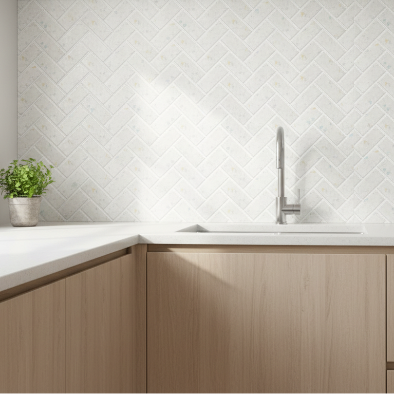 Terrazzo fiskebein selvklebende veggfliser imiterer terrazzo i fiskebeinsmønster i behagelige lyse toner. Passer godt til kjøkken og bad.