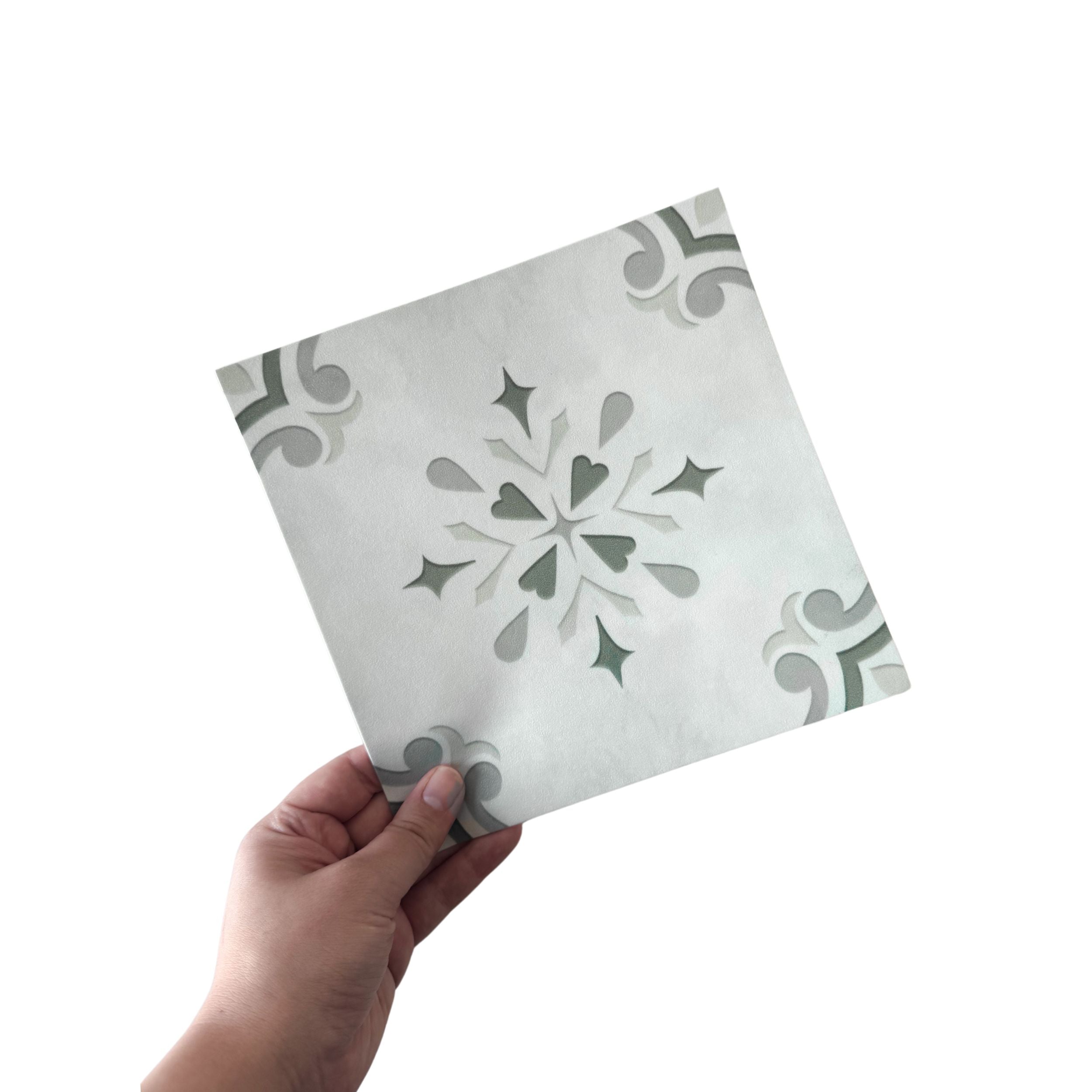 Amilia grønn selvklebende fliser imiterer et klassisk mønster i mørk hvit og grønn. Den gir et dempet og diskret uttrykket i behagelige farger.
