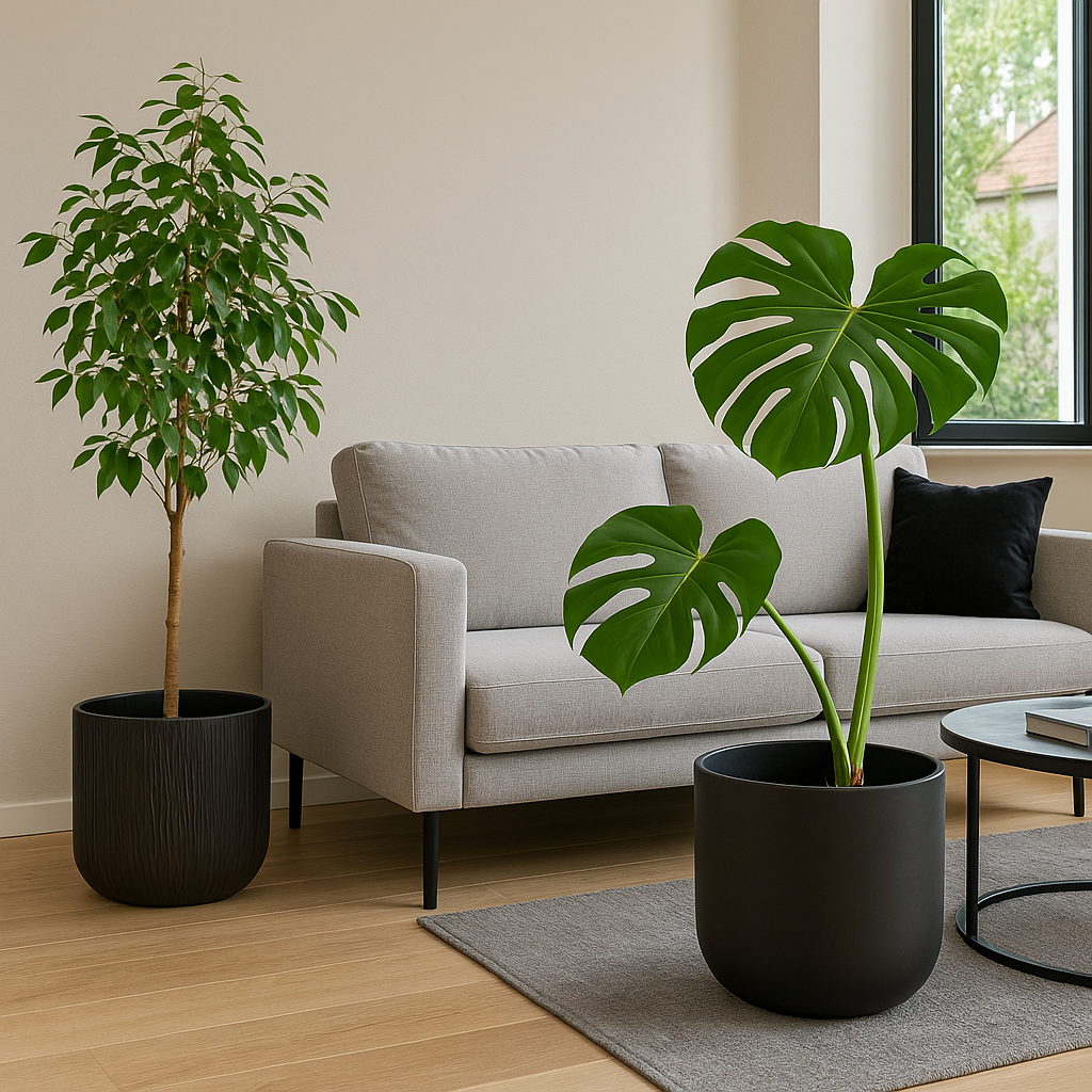 To sorte keramiske blomsterpotter, en glatt og en strukturert, på tregulv i moderne stueinteriør