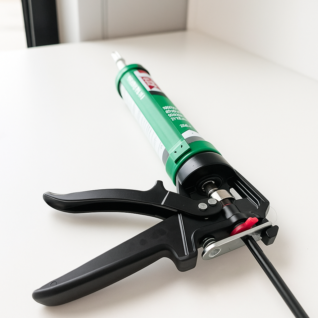 Person påfører fugemasse med TEC7 fugepistol fra Lindas Dekor, ideell for presis tetting og liming.