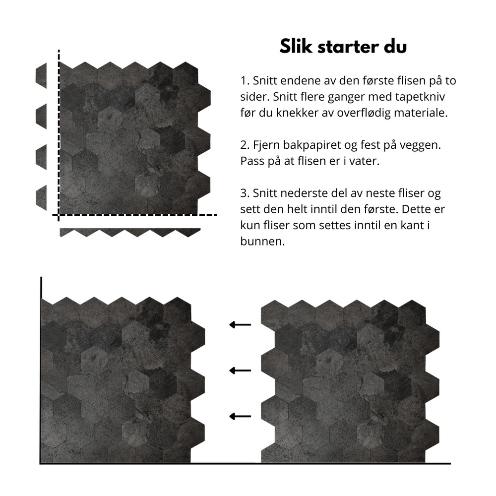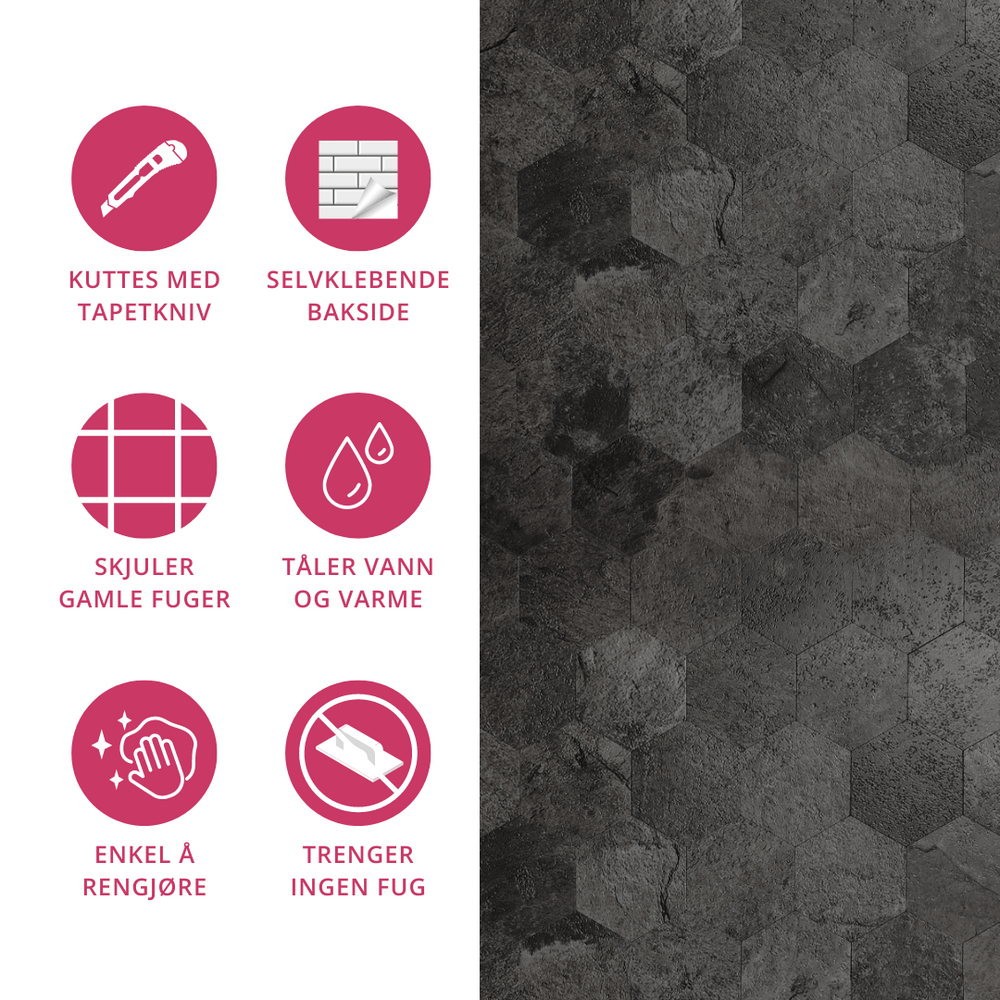 Hexagon mörkgrå betong självhäftande väggplattor regnes som en permanent løsning. Dersom du ønsker å fjerne flisene i ettertid anbefaler vi å bruke kontaktplast mellom underlaget og flisene.