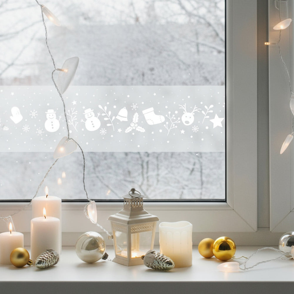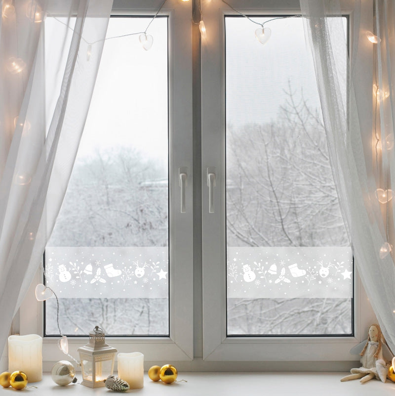 Vindusfolie med julemotiv og frostet effekt brukt på stuevindu
