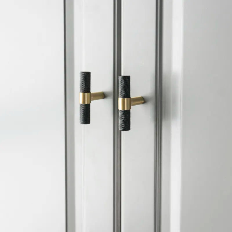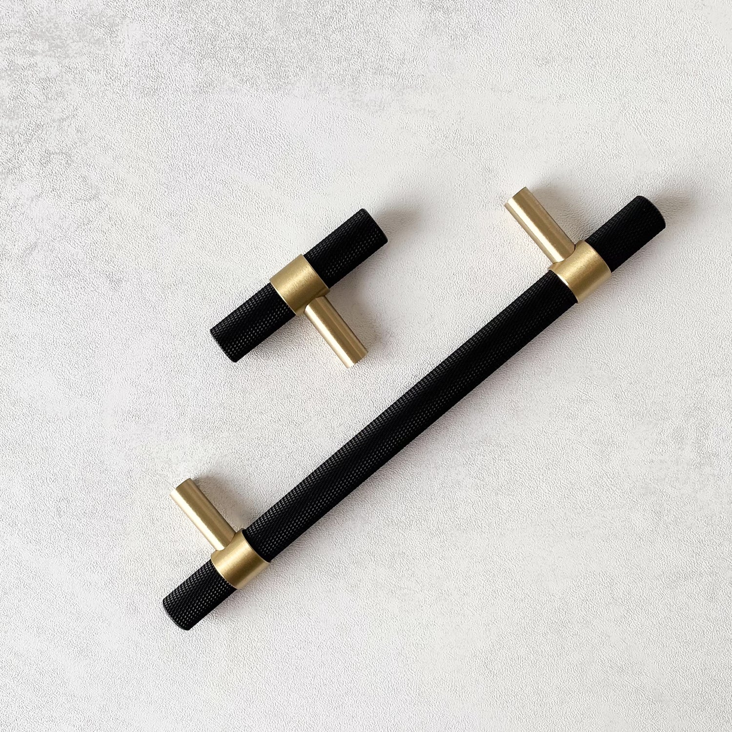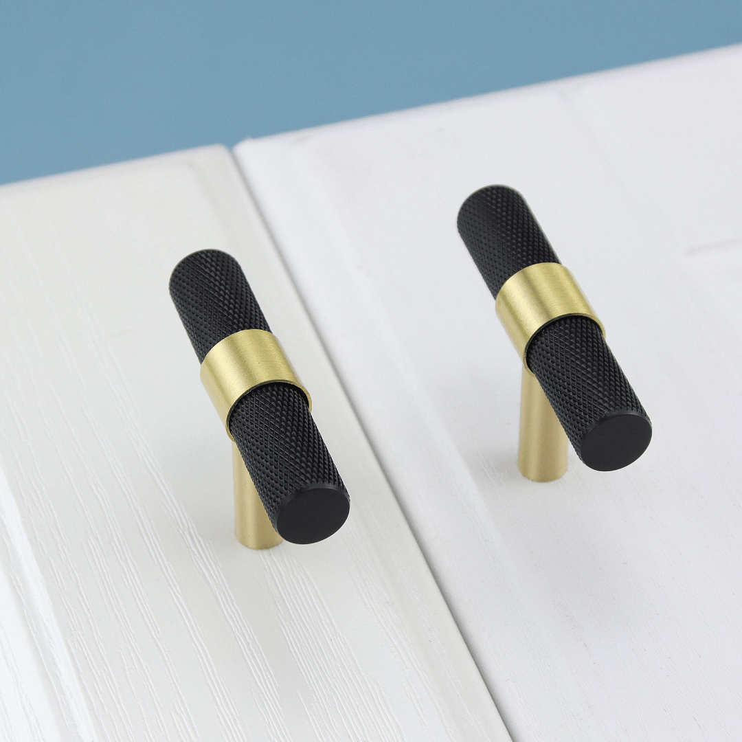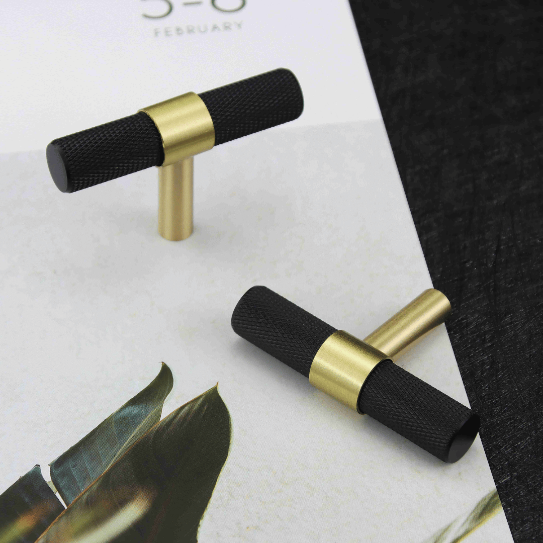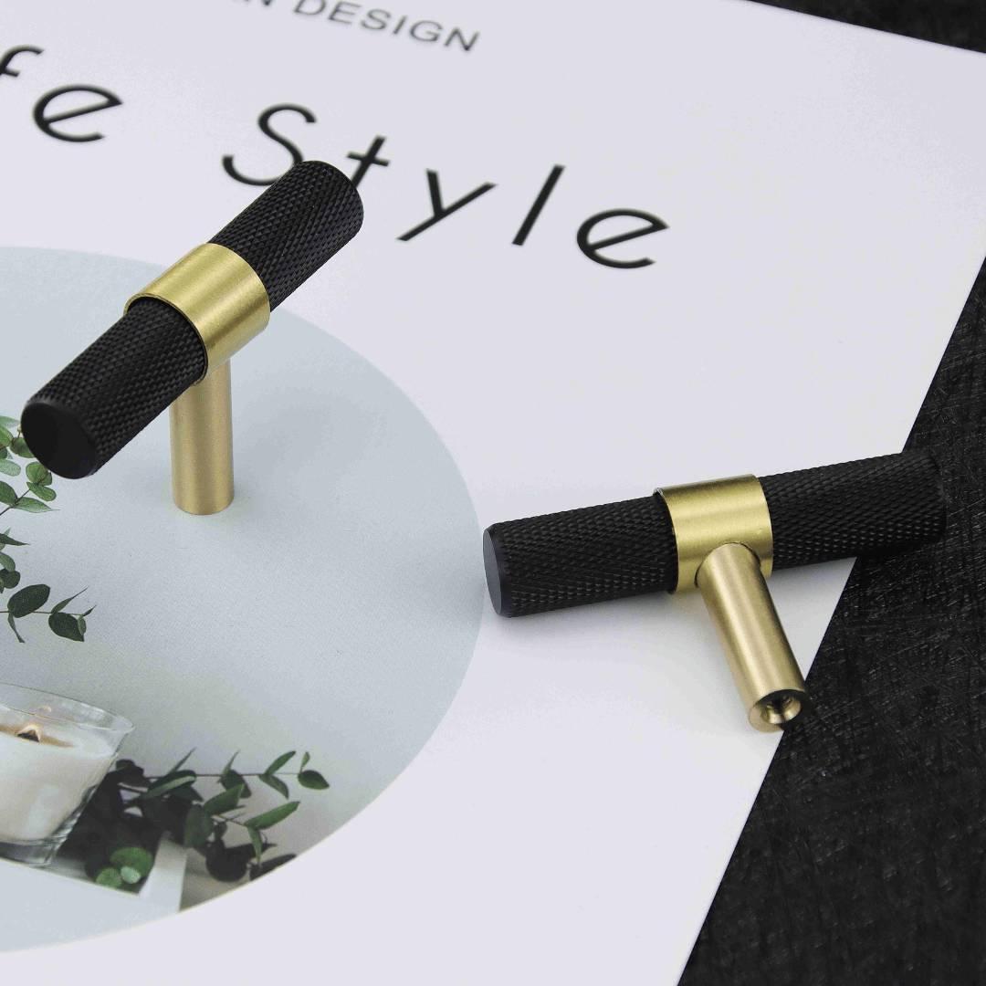 New York T-bar handtag i svart och guld mässing. Handtaget har en modern och tidlös design. Perfekt för både byrå, köksmöbler, nattduksbord - gör dina möbler unika med detta härliga handtag.