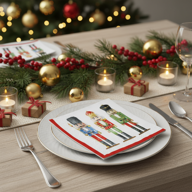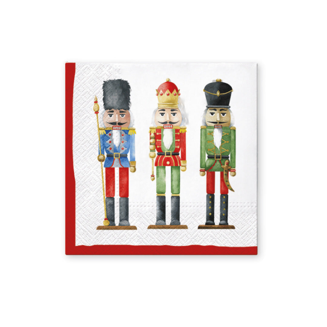 Søte servietter med nøtteknekkere. Pynt opp middagsbordet i julen med disse råkule serviettene. Serviettene er 3-lagspapirservietter og kommer med 20 stk i pakken.
