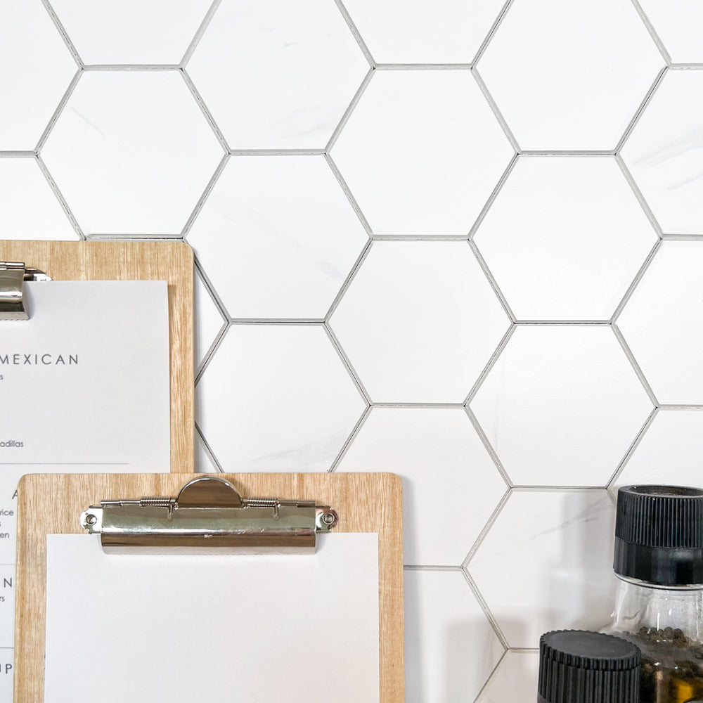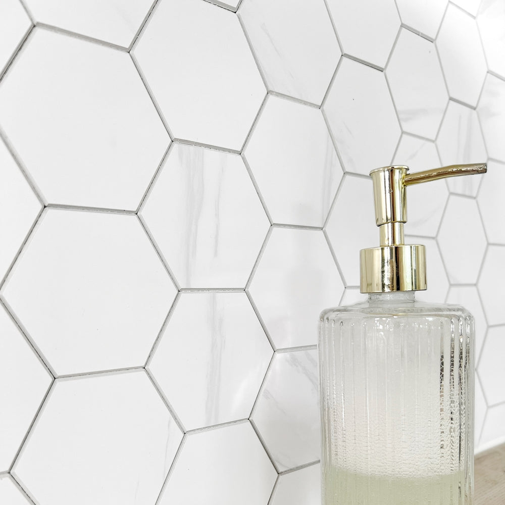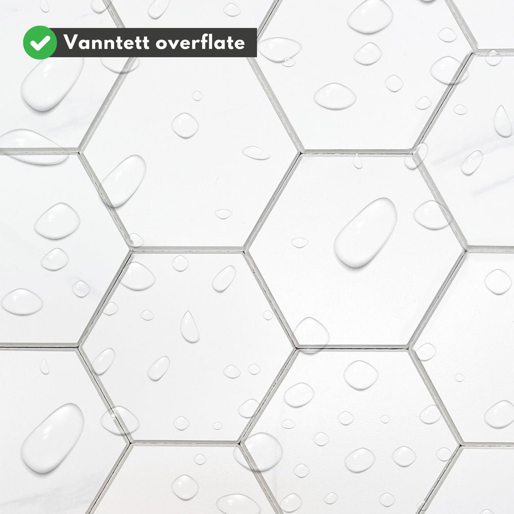 Väggplattor i sten hexagon marmor regnes som en permanent løsning. Dersom du ønsker å fjerne flisene i ettertid anbefaler vi å bruke kontaktplast mellom underlaget og flisene.