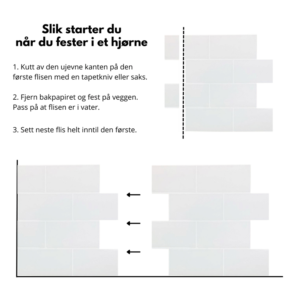 Du sparer både tid og penger med selvklebende veggfliser. Flisene monteres direkte på din eksisterende vegg, og er perfekt som sprutvegg og ellers på kjøkken, bad, vaskerom og gang.
