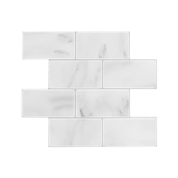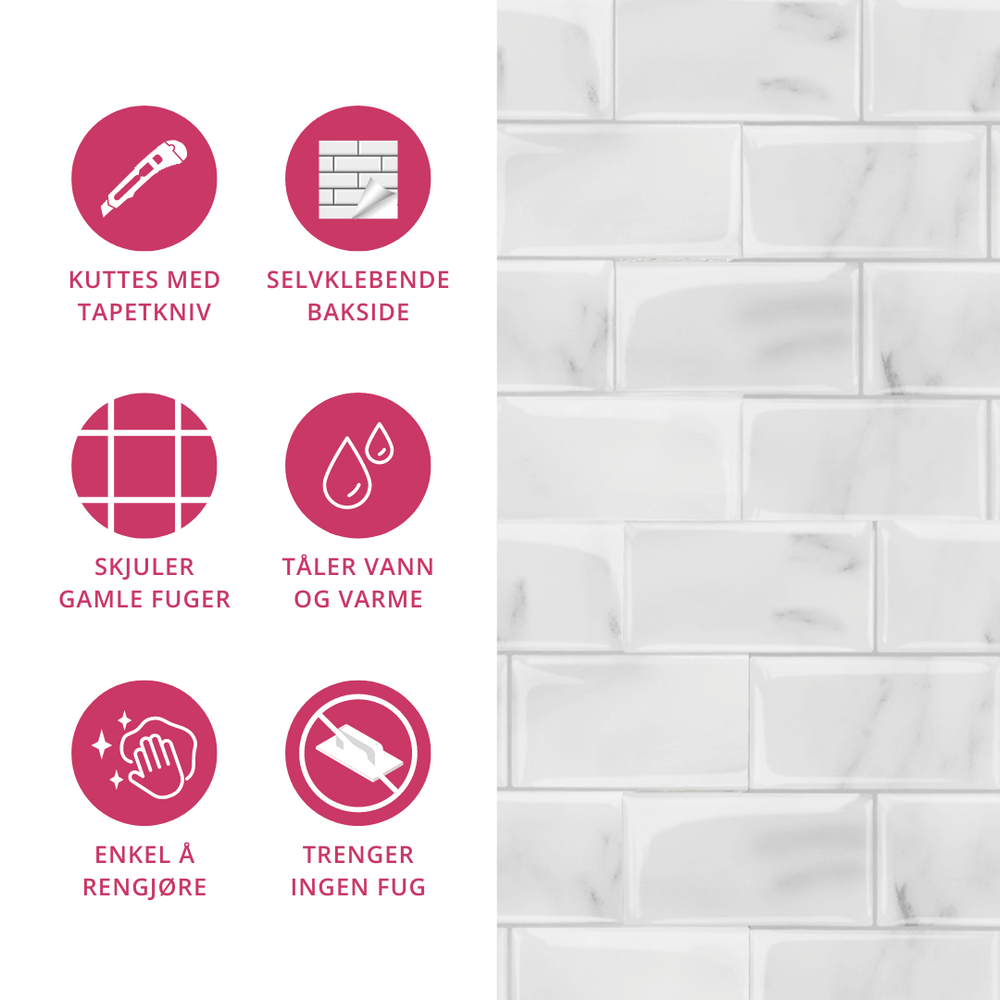 Dessa vackra självhäftande plattor imiterar moderna Subway-plattor i delikat marmor. Kakelplattorna är perfekta för att lyfta kök, tvättstugor och badrum till nya höjder!