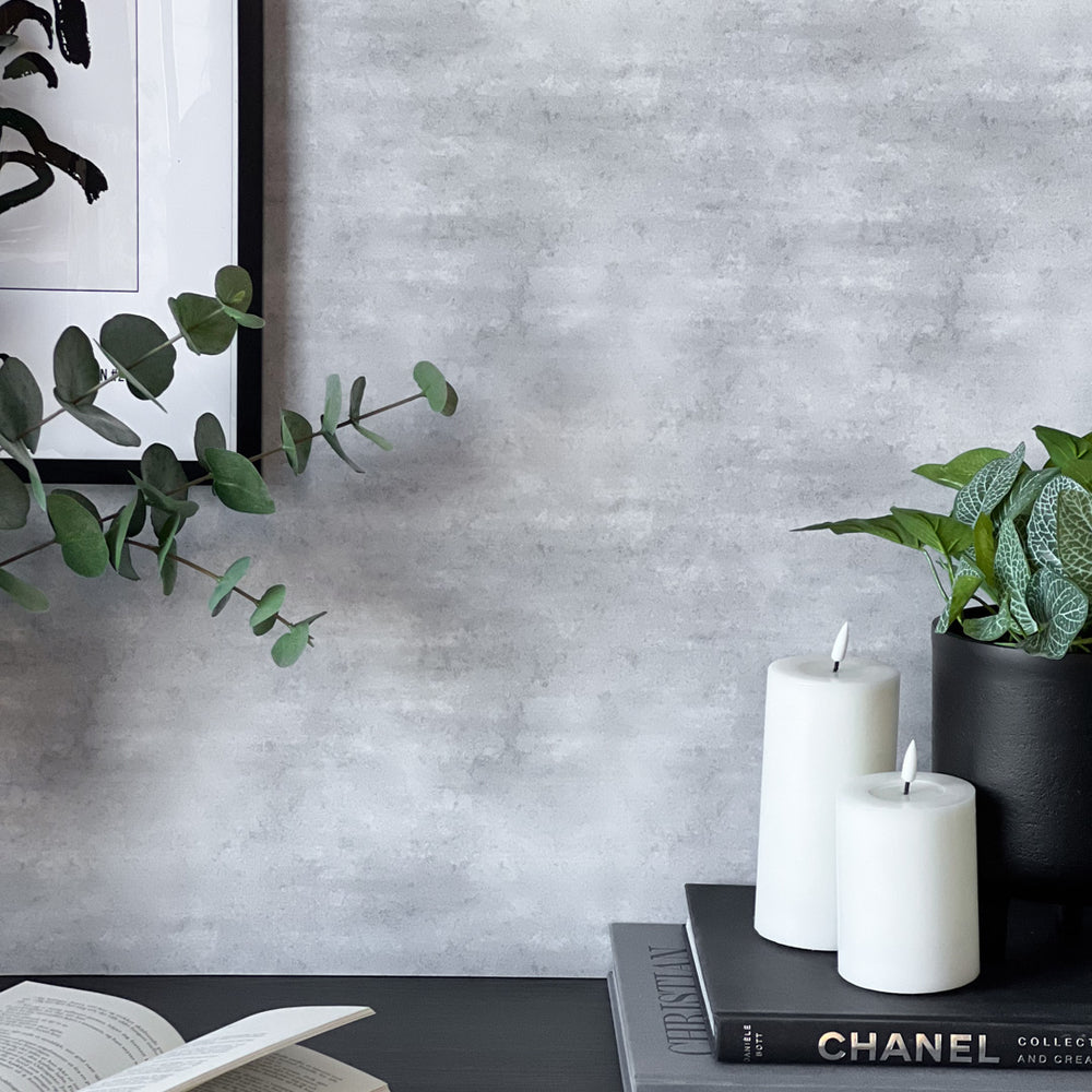 Betonggrå kontaktplast er en populær bestselger som imiterer betong. Den gir et tidløst og industrielt preg. Passer godt til fornyelse av baderom.