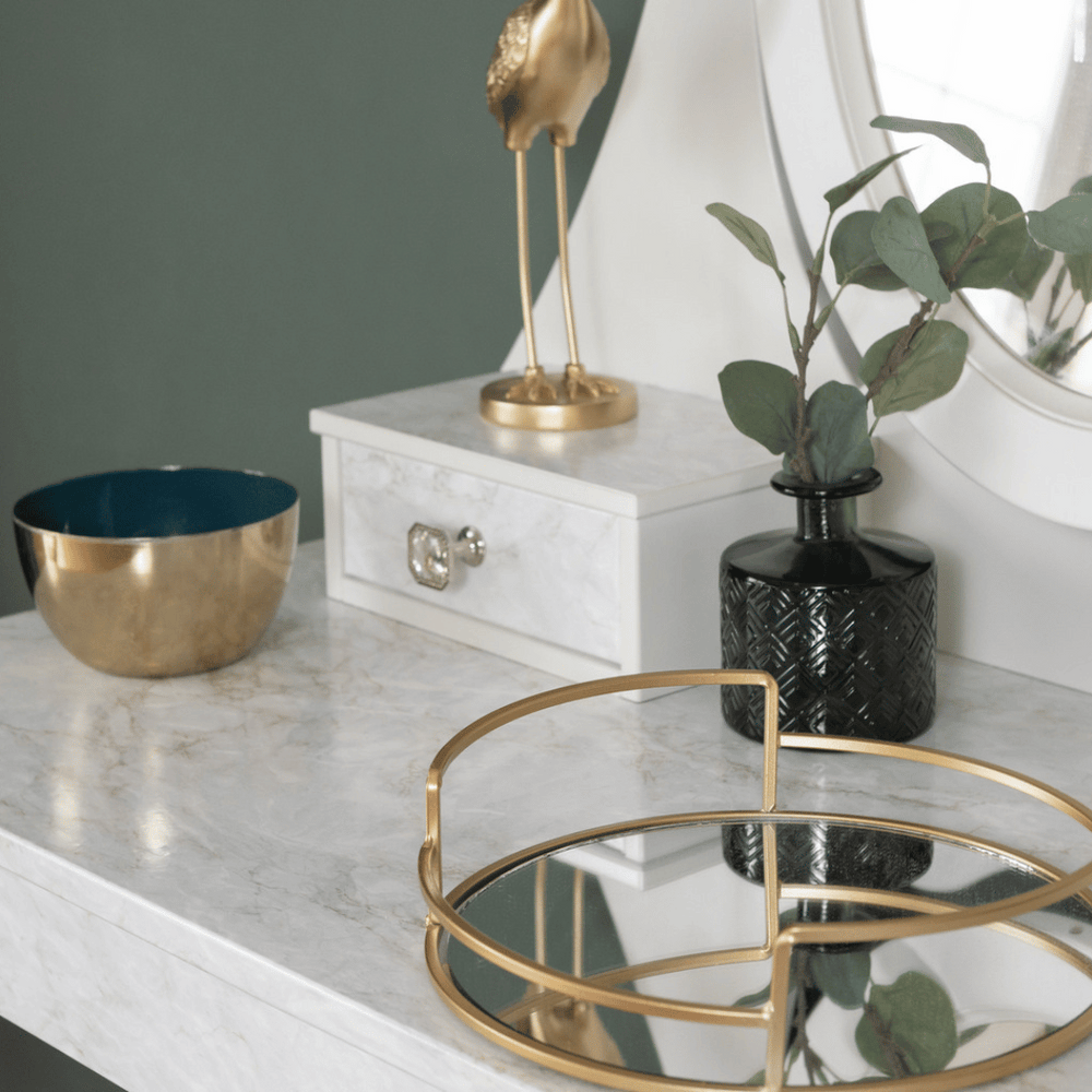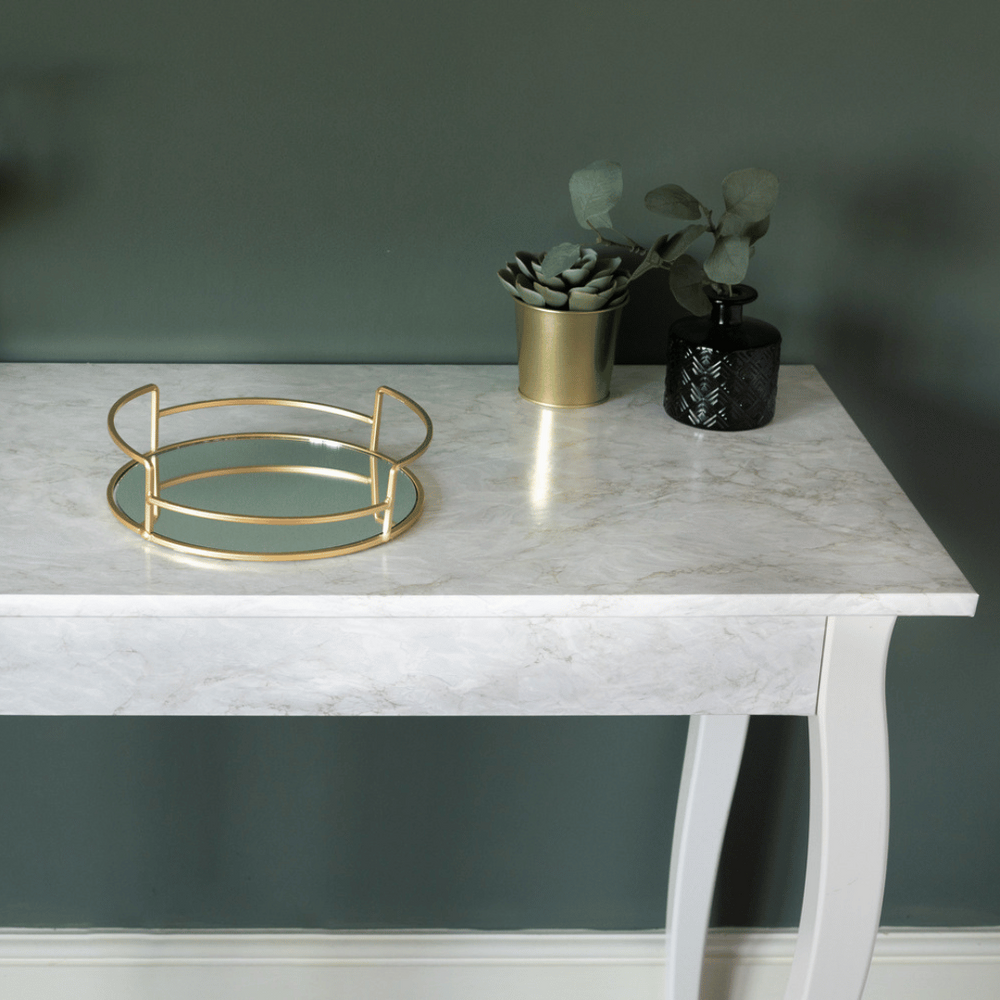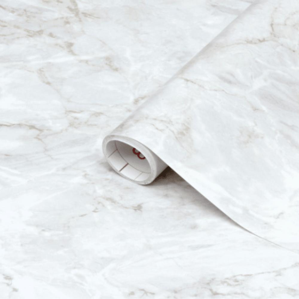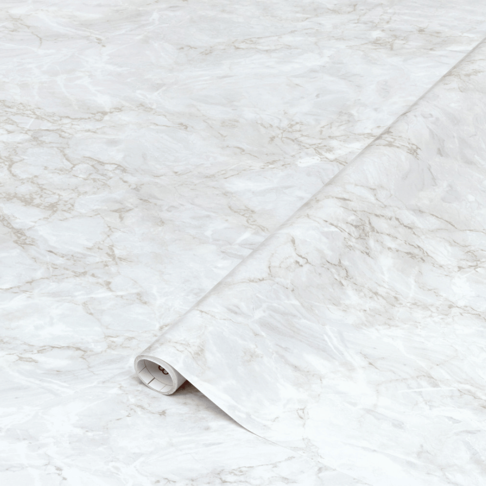 Dekorativ, självhäftande folie i toppkvalitet. Kontaktplasten kommer färdig med lim på baksidan, så allt du behöver göra är att ta bort skyddspappret och fästa det där du vill. Folien imiterar marmor och har små gulddetaljer. Perfekt för bänkskivor, bord, byråer med mera.
