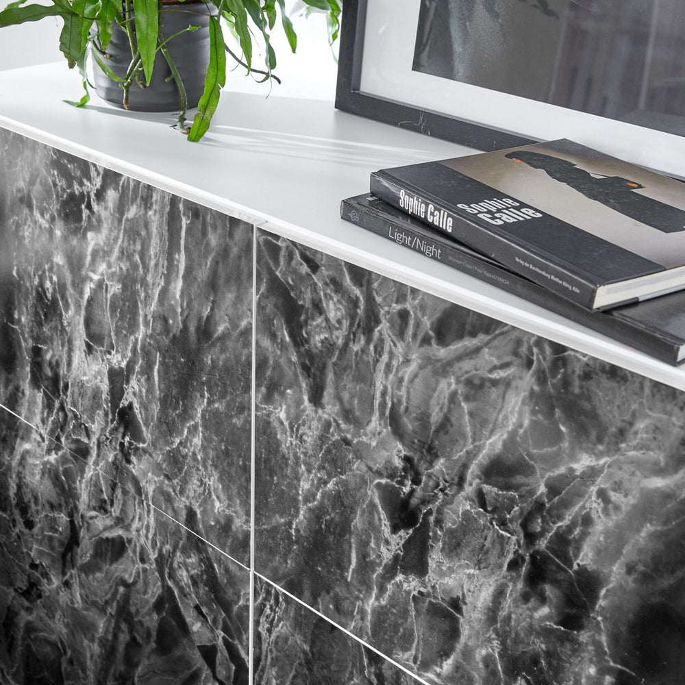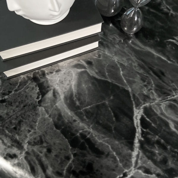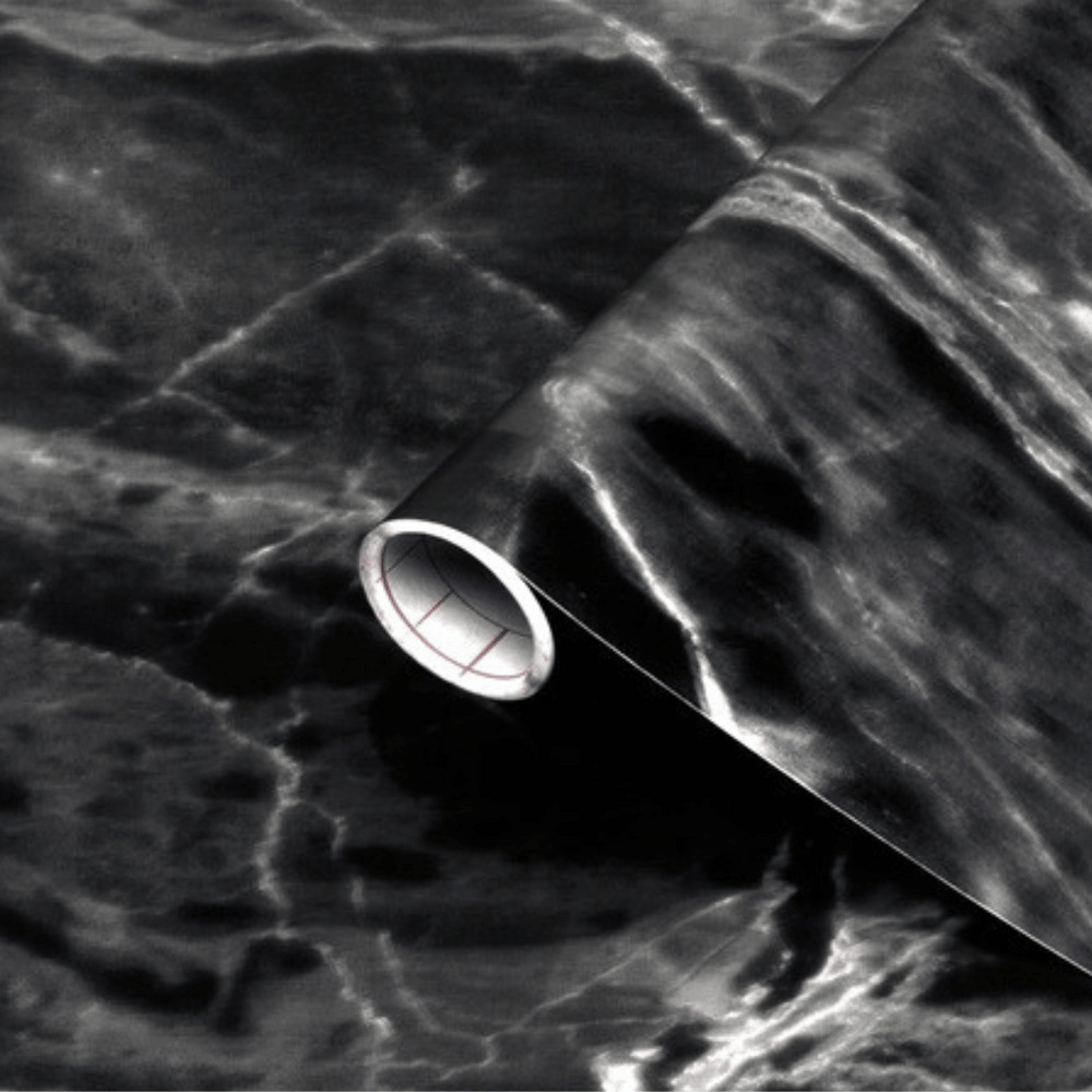 Dekorativ, självhäftande folie i toppkvalitet. Kontaktplasten kommer färdig med lim på baksidan, så allt du behöver göra är att ta bort skyddspappret och fästa det där du vill. Folien imiterar svart marmor med inslag av silver, och är perfekt för bord, byråer, köksbänkar, nattduksbord mm.