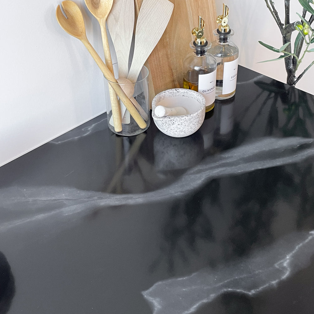 Tjockare, unik kontaktplast med självhäftande baksida. Denna härliga folie imiterar svart marmor. Skär folien till önskad storlek, dra av bakpappret och stick var du vill. Eftersom denna folie är tjockare kan den vara mer utmanande att använda runt hörnen. Perfekt för att förnya kök, badrumsinredning, väggar, tv-bänkar och mycket mer.