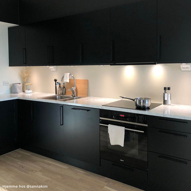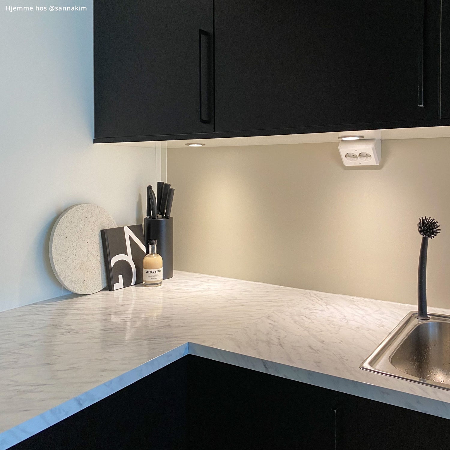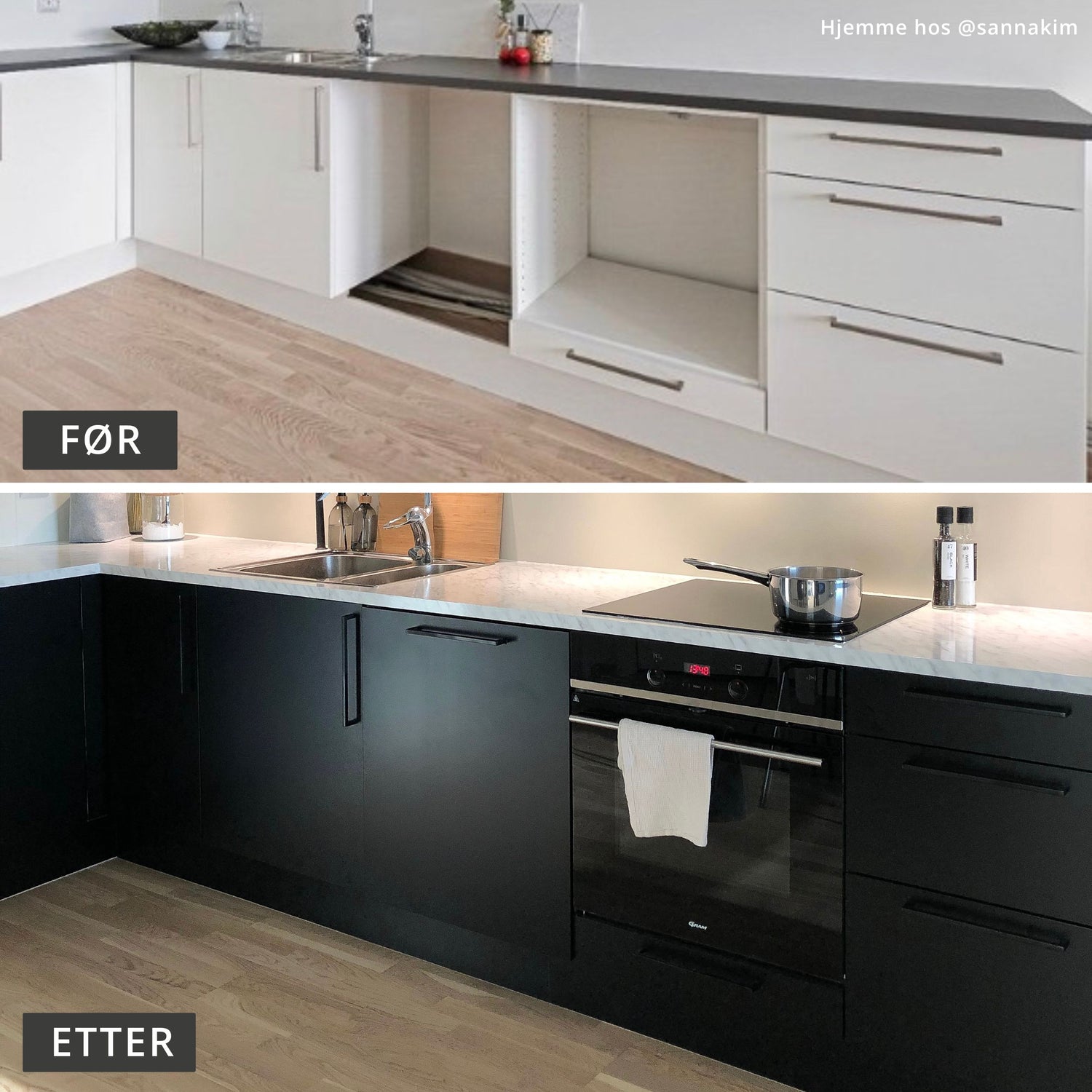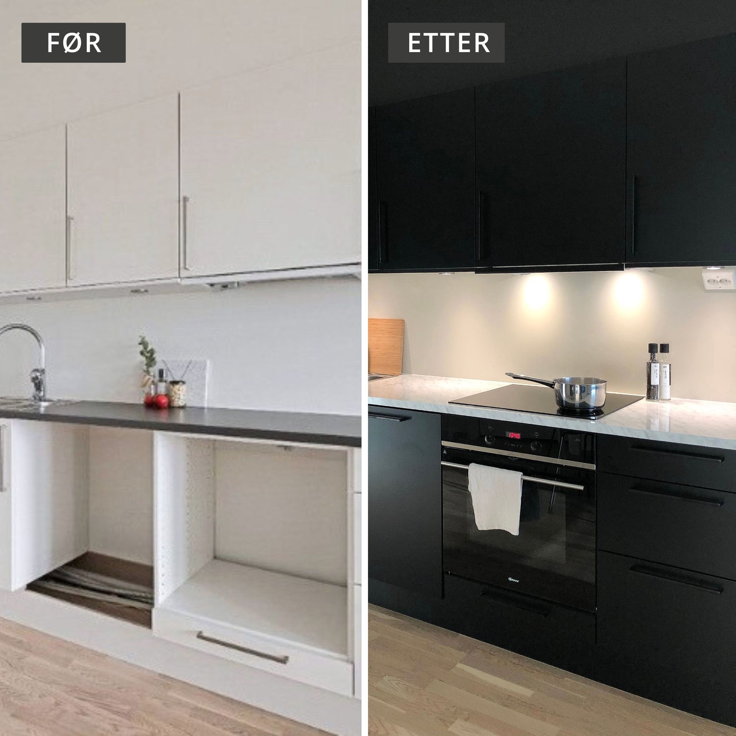Lyst til et moderne, nordisk kjøkken så er denne pakken perfekt for deg. Denne pakken gir deg et sort kjøkken med lys, hvit benkeplate som imiterer marmor.
