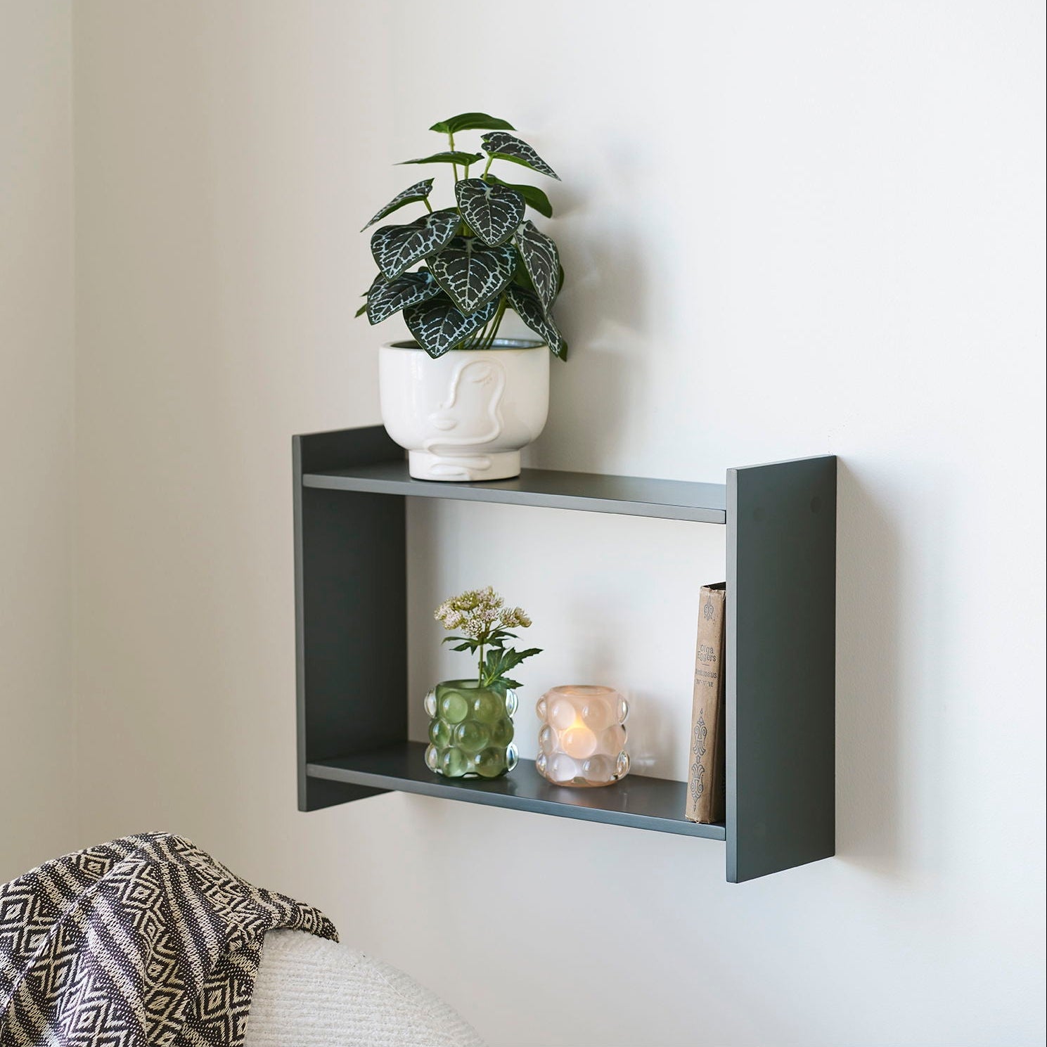 Gi veggen et friskt og moderne uttrykk med Bamberg vegghylle i grønn utførelse. Den dempede grønntonen tilfører rommet karakter uten å dominere, og skaper en rolig kontrast mot lyse vegger og naturmaterialer.