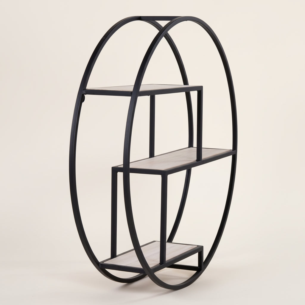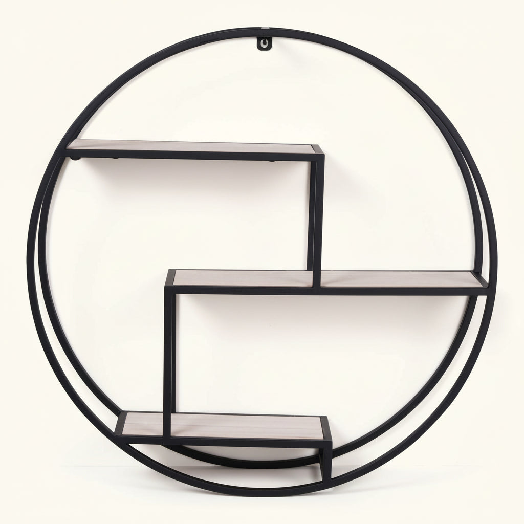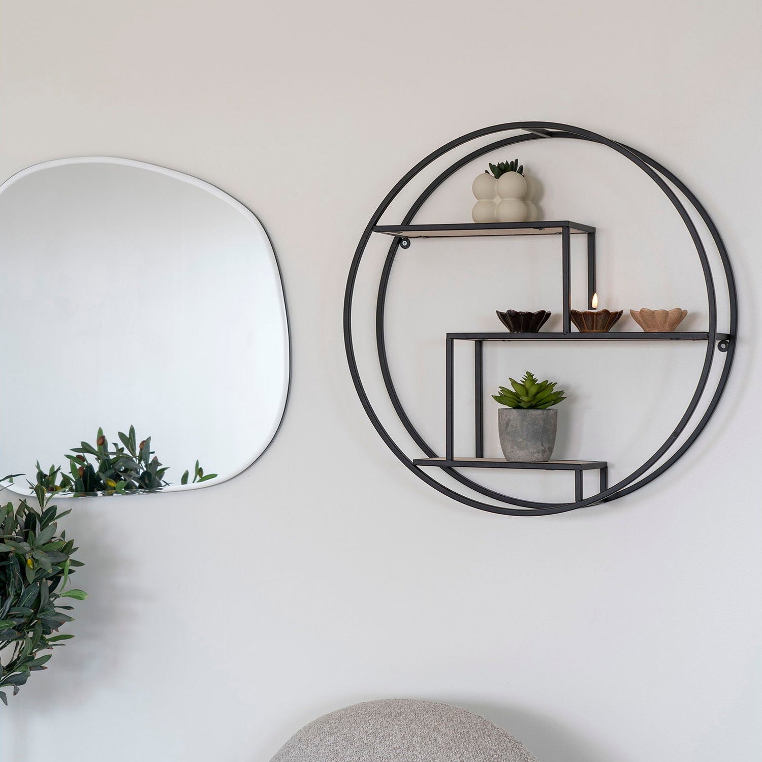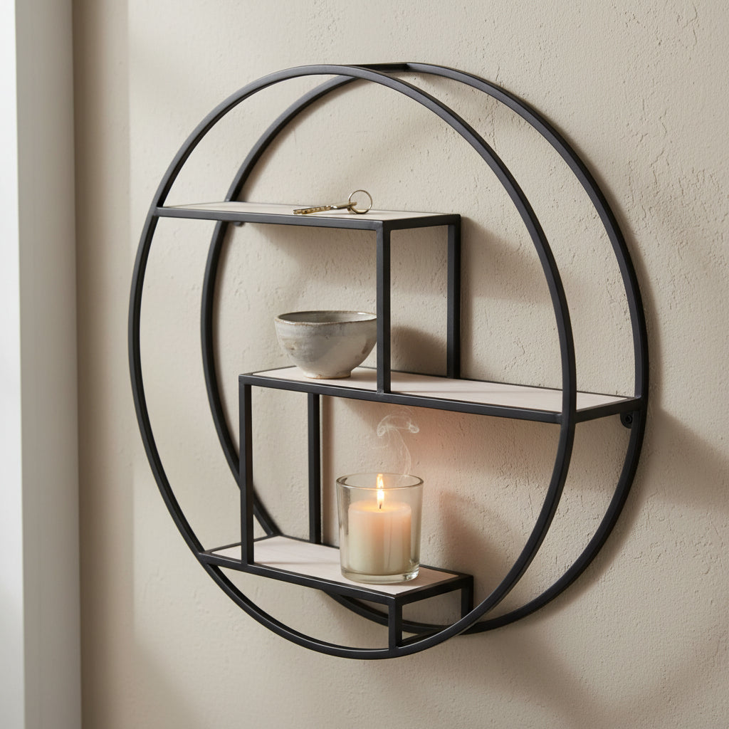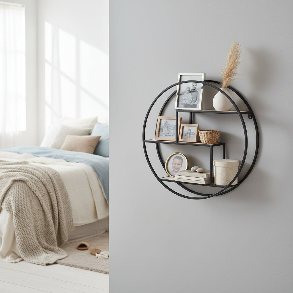 Diameter 62 cm og dybde 14 cm gir god plass uten å stjele romfølelse. Den runde, sorte metallrammen gir et moderne uttrykk, mens trehyllene tilfører varme og gjør hyllen lett å style med både naturmaterialer og stramme kontraster.