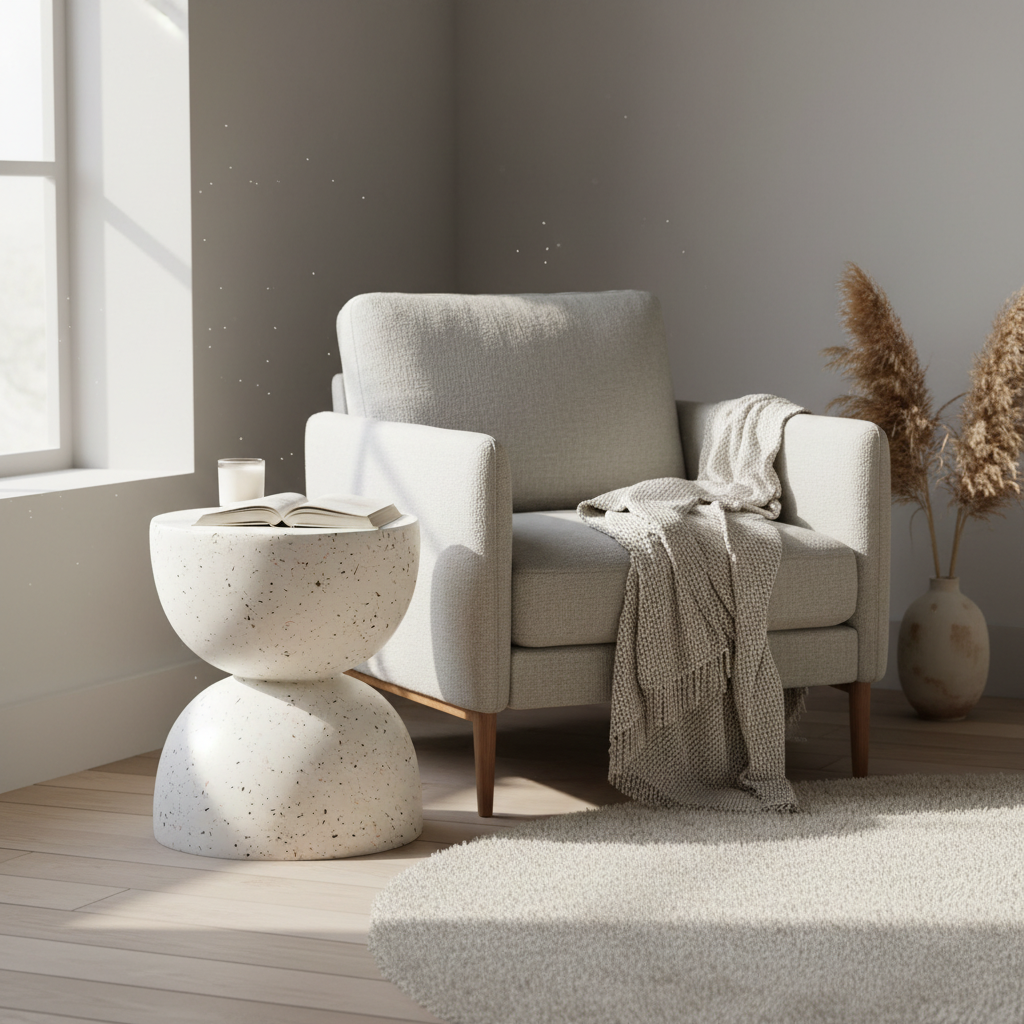 Med off white farge, terrazzo look og solid konstruksjon i magnesiumoksid og glassfiber får du et sidebord som kombinerer dekorativ form med praktisk funksjon. Bordet fungerer fint som avlastningsbord ved loungestol, som plass til kaffekopp og bok, eller som en stilfull base for lys og planter.