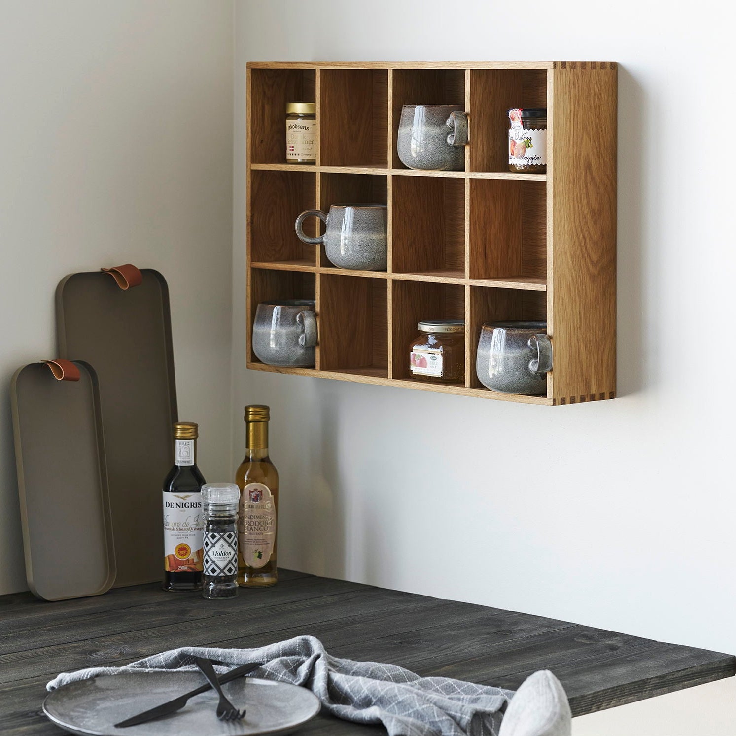 Med en dybde på kun 11 cm bygger hyllen minimalt ut fra veggen, noe som gjør den perfekt i gang, kjøkken eller mindre rom hvor plassen er begrenset. De åpne rommene skaper et ryddig uttrykk og gir fine soner for små planter, kopper, dekor eller samleobjekter.
