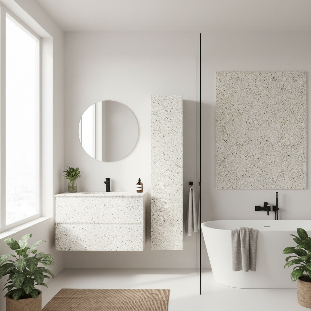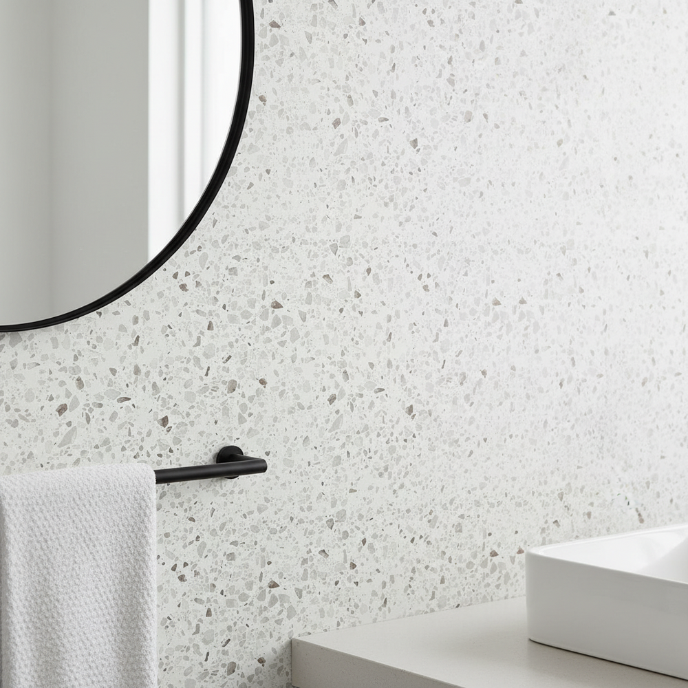 Tjockare, unik kontaktplast med självhäftande baksida. Denna härliga folie imiterar terrazzo. Skär folien till önskad storlek, dra av bakpappret och stick var du vill. Eftersom denna folie är tjockare kan den vara mer utmanande att använda runt hörnen. Perfekt för att förnya kök, badrumsinredning, väggar, tv-bänkar och mycket mer.