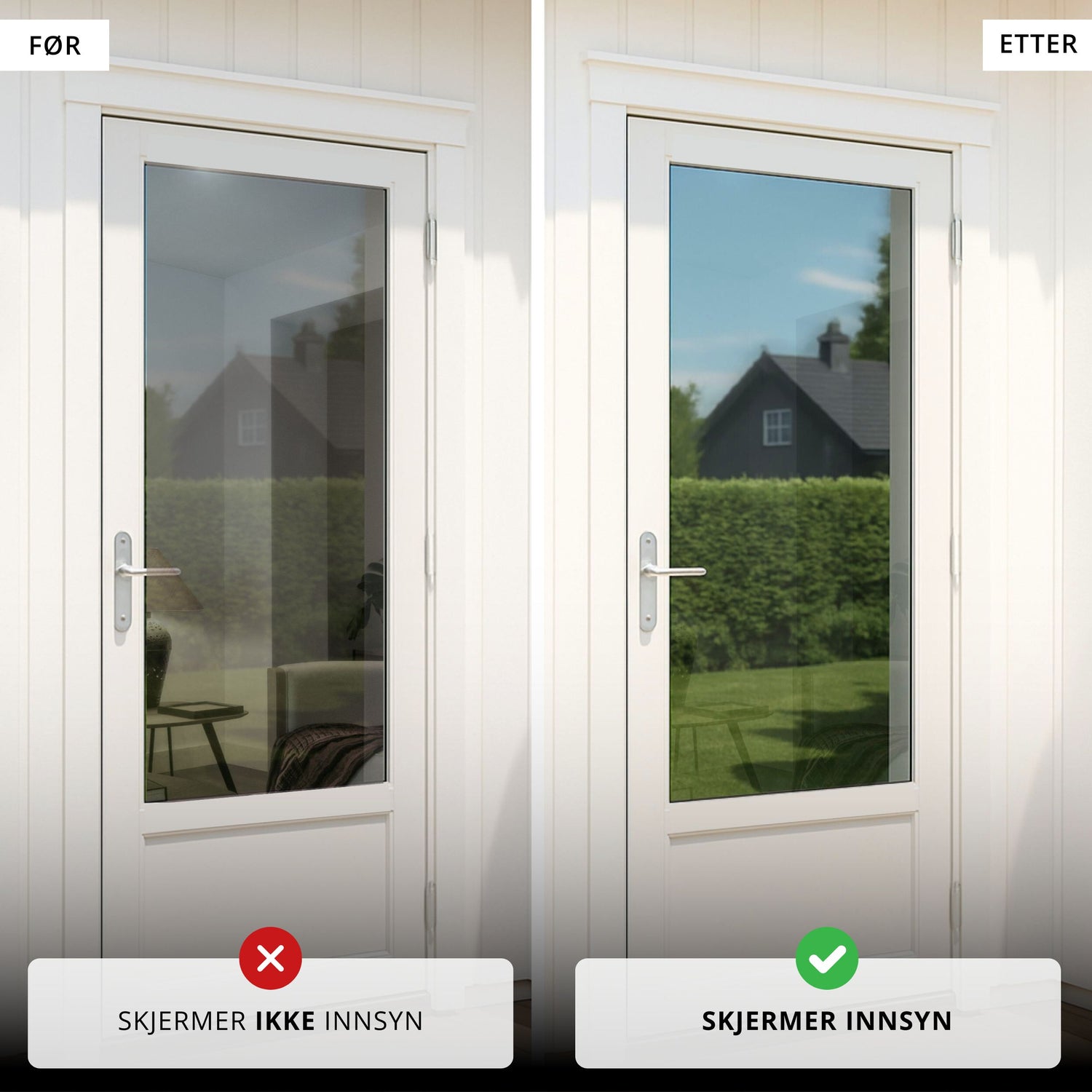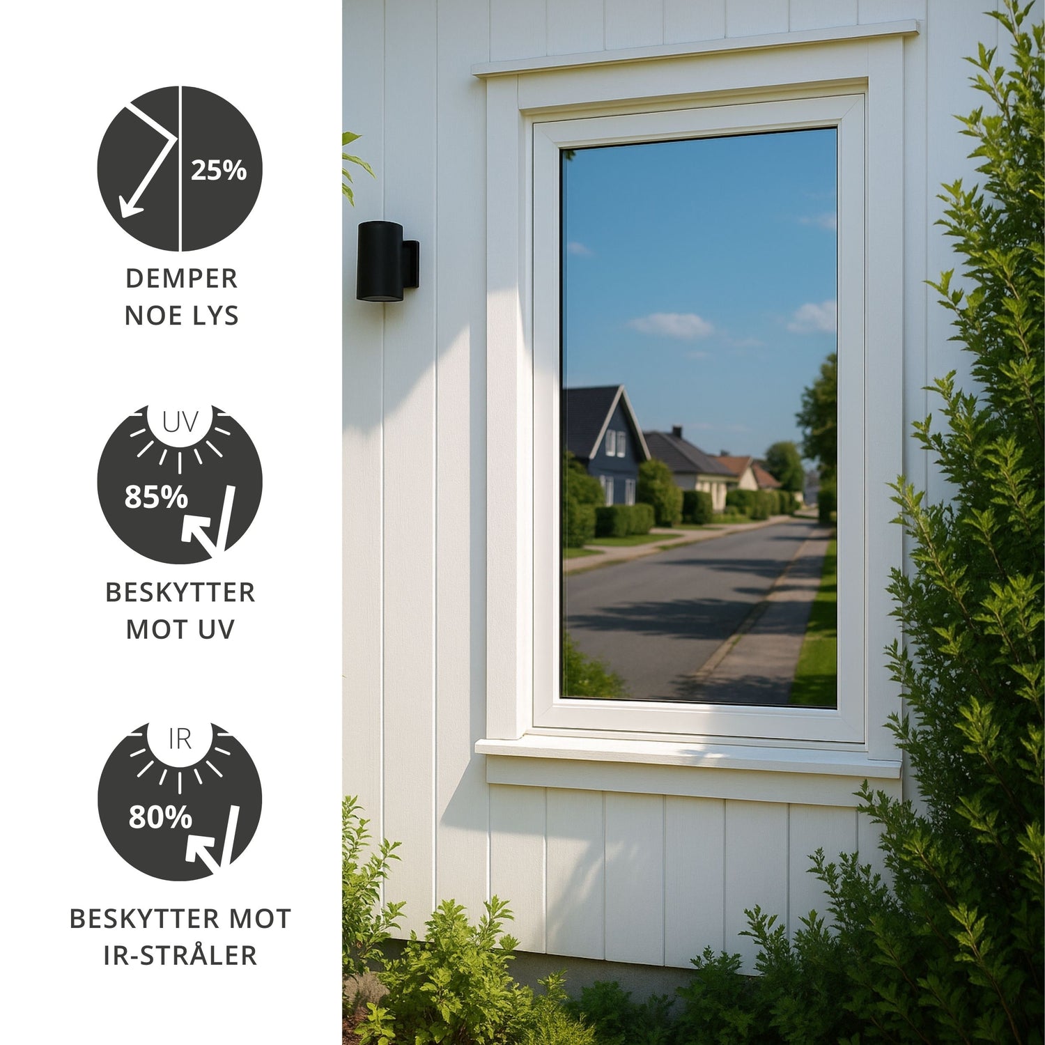Static Reflektiv gir effektiv solskjerming og skjerming av innsyn med en elegant speileffekt på dagtid. Denne selvklebende folien gjør det mulig å se ut, samtidig som den hindrer innsyn utenfra, noe som gir deg økt privatliv og komfort i hjemmet. På kveldstid, når det er mørkt ute og lyst inne, kan du bruke utelys for å bevare den reflektive effekten. Folien er ikke egnet på rom man ønsker fullstendig skjerming døgnet rundt, f.eks bad.