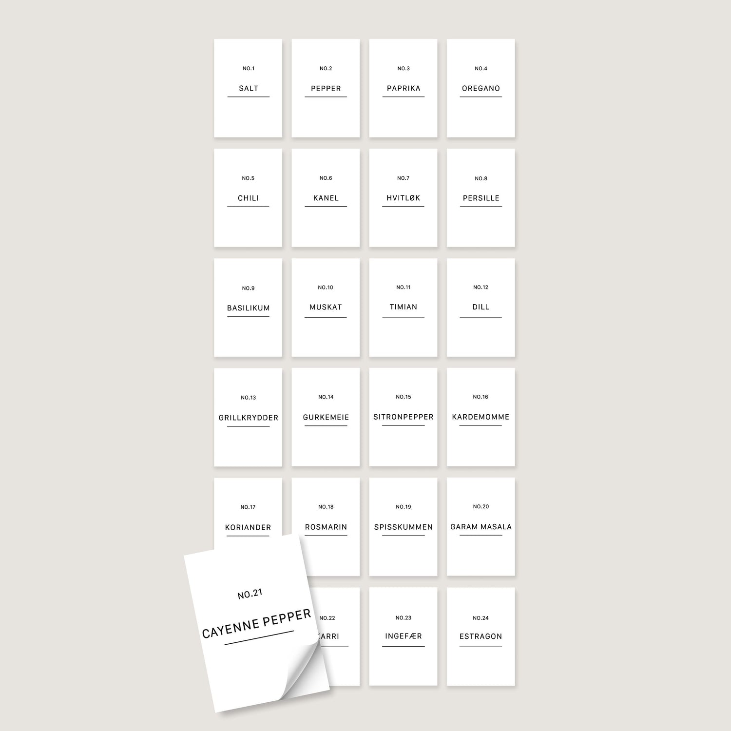 Detta paket innehåller etiketter för: Salt, Peppar, Paprika, Oregano, Chili, Kanel, Vitlök, Persilja, Basilika, Muskotnöt, Timjan, Dill, Barbecuesås, Gurkmeja, Citronpeppar, Kardemumma, Koriander, Rosmarin, Spiskummin, Garam Masala, Cayennepeppar, Curry, Ingefära, Dragon