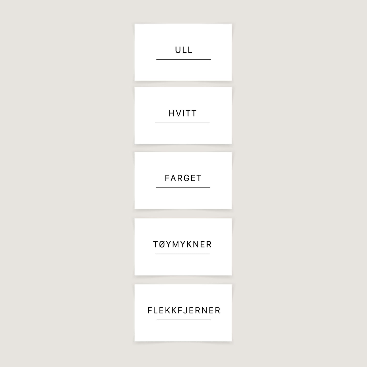 Detta paket innehåller etiketter för: Ull, Vit, Färgad, Sköljmedel, Fläckborttagare