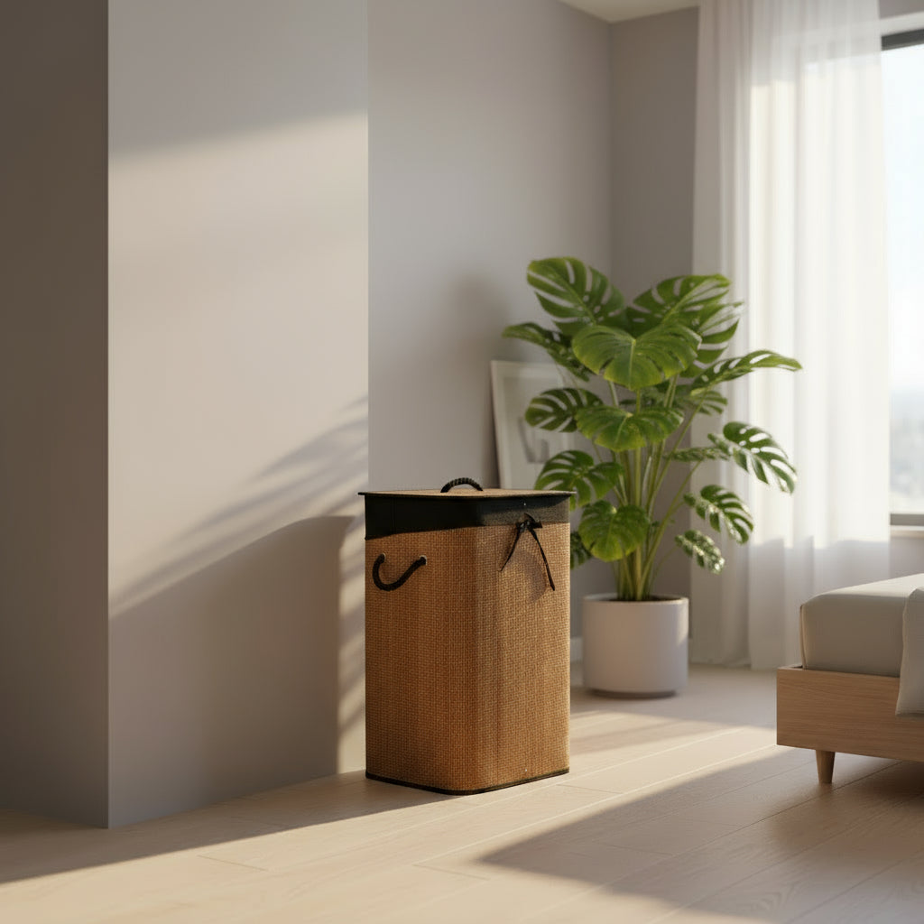 Den inre linnepåsen kan tas bort för enkel tömning och tvätt, och locket håller din smutsiga tvätt dold. Bambumaterialet ger en varm och ren känsla, samtidigt som det är lätt att hålla rent.