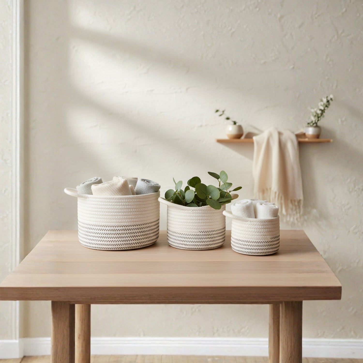 Förvaringskorgar tillverkade av mjuk bomull som behåller formen över tid . De neutrala färgerna och den enkla designen passar perfekt i alla rum, oavsett om du vill använda dem för förvaring av småsaker i badrummet, barnrummet eller som dekoration i vardagsrummet.